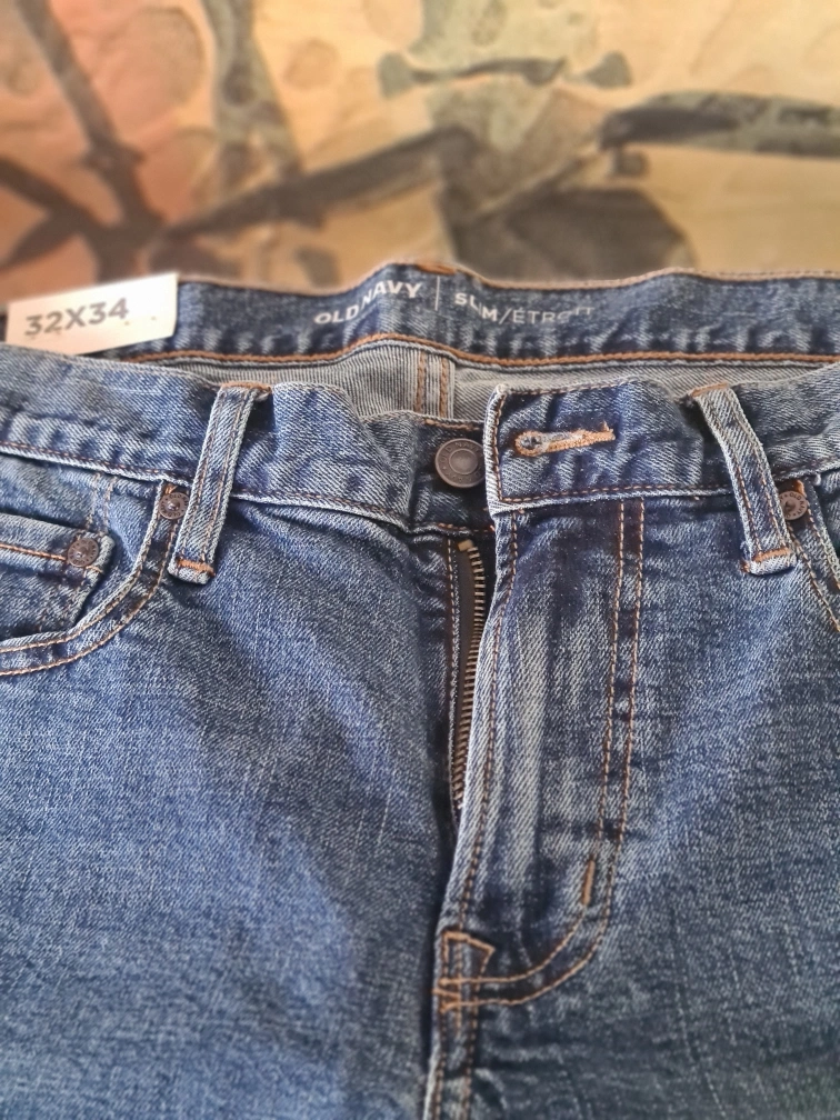Men's Old Navy Famous Jeans. Slim fit. Size 32x34. New with tags. Just below waist, slim thigh, slim leg.