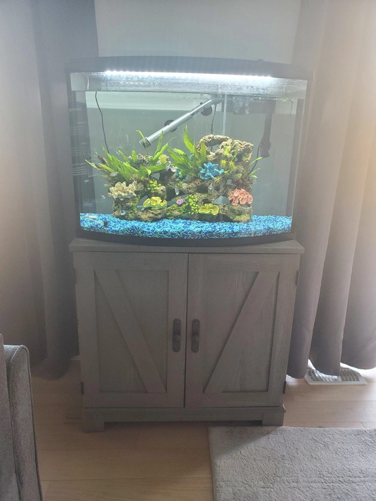 Beautiful curved aquarium with stand. Includes light and filter. Great for small fish. Ready for a new home. everything included