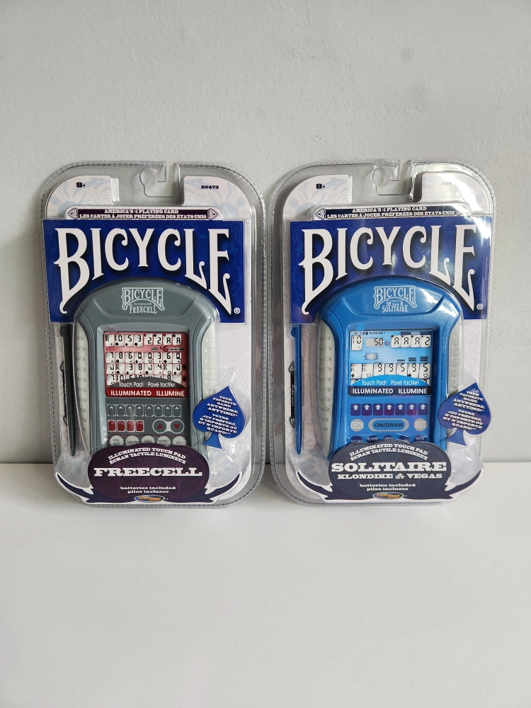 Two handheld electronic games. One plays FreeCell, the other plays Klondike and Vegas Solitaire. Features illuminated touch pad screen, sound control, and a stylus. Batteries included. Great for travel.
