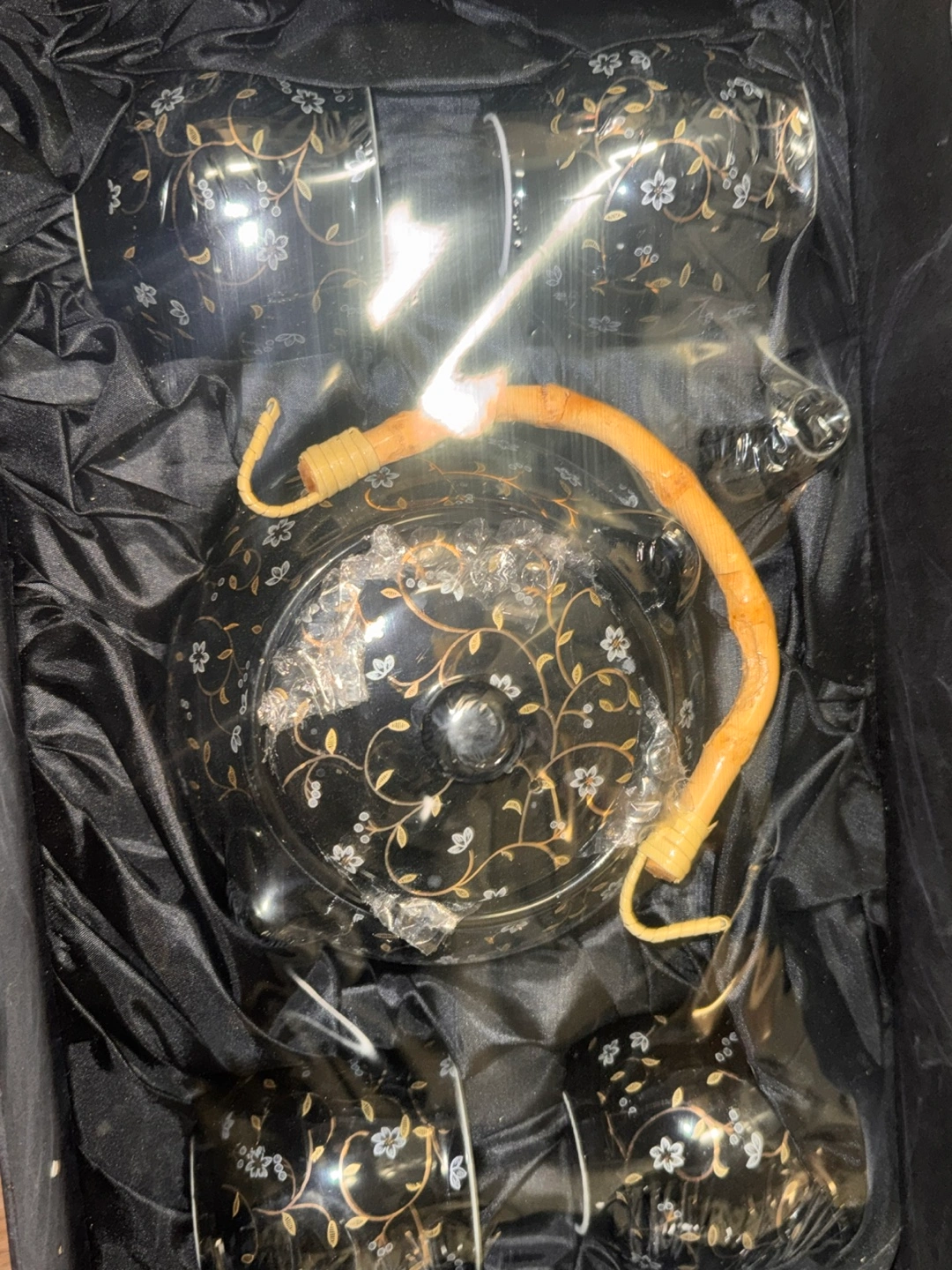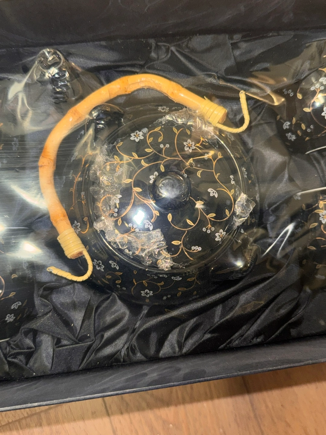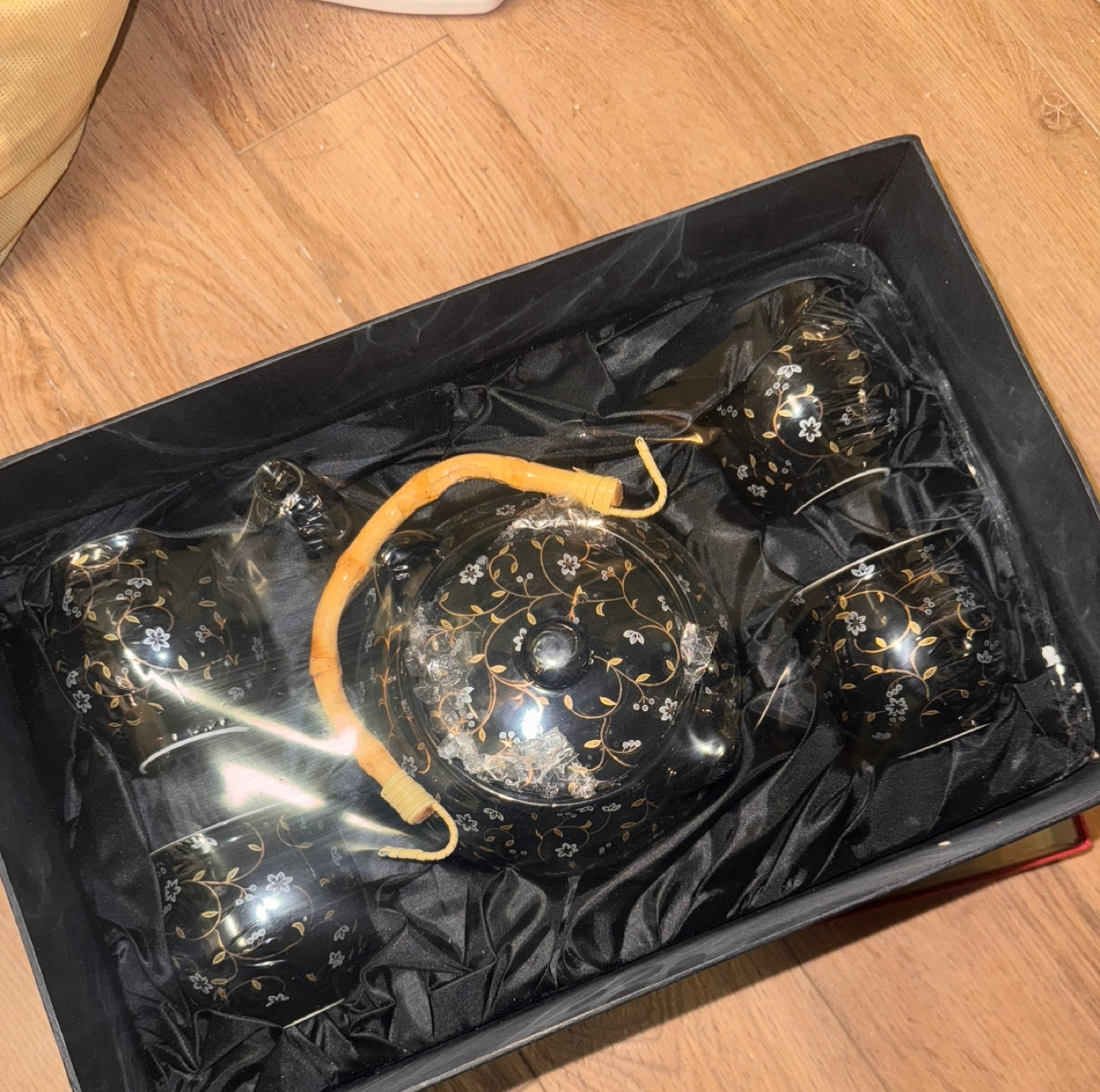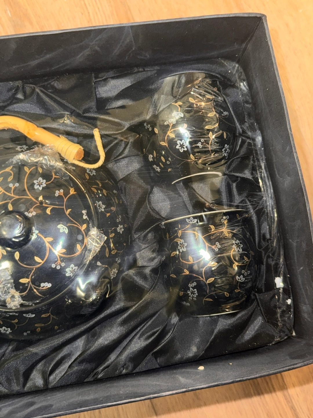1000+Beautiful fine porcelain blue tea set, four cups and teapot. Black with gold floral design. Bamboo handle. New, in box.