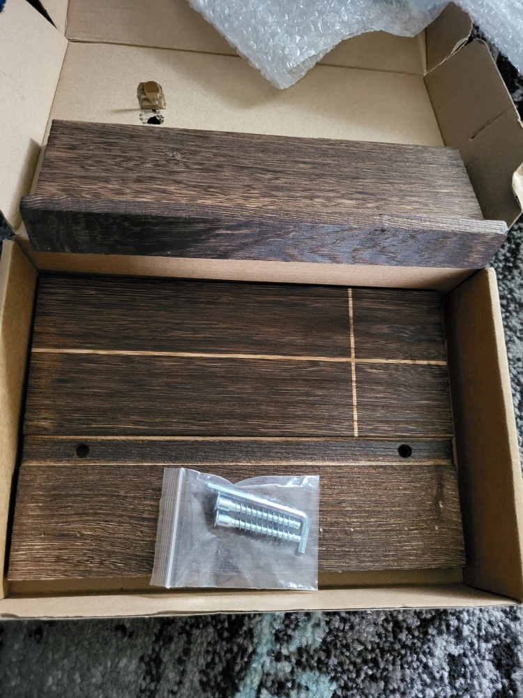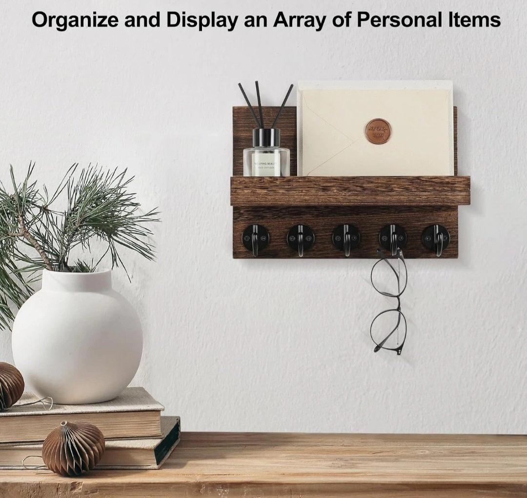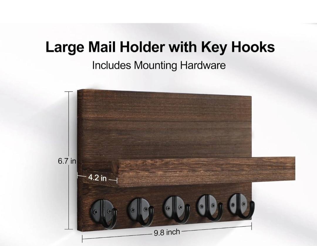 Dark brown wooden key holder. Five black metal hooks are missing. Small shelf. Perfect for entryway organization. Includes mounting hardware. Adds rustic charm to your home.