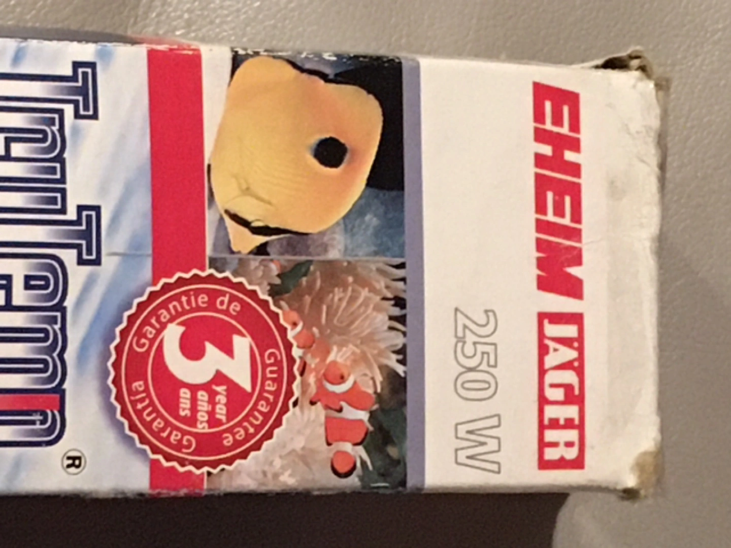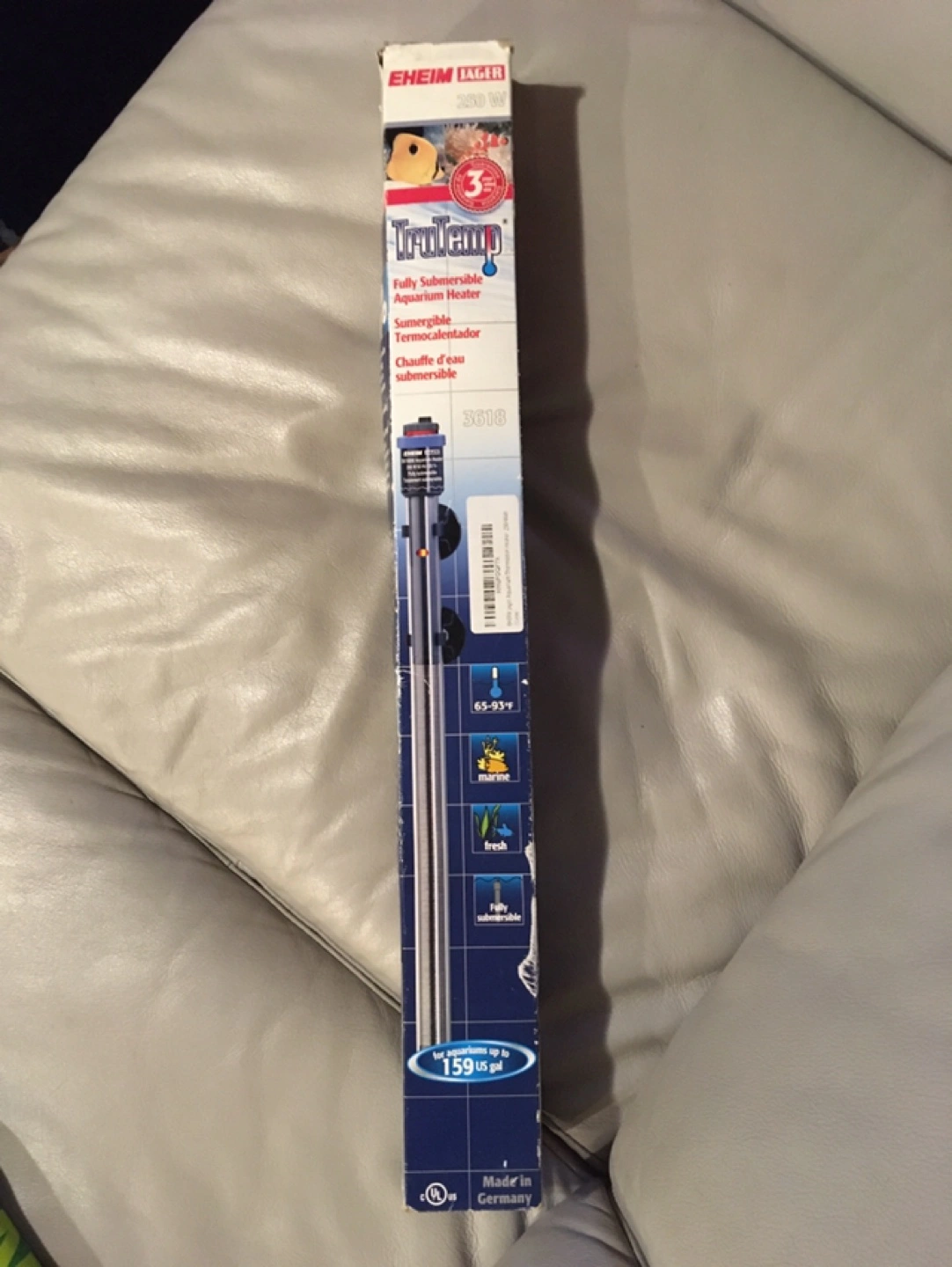 New in box, fully submersible aquarium heater. 250 watts, for aquariums up to 159 US gallons. Made in Germany. Three-year warranty.