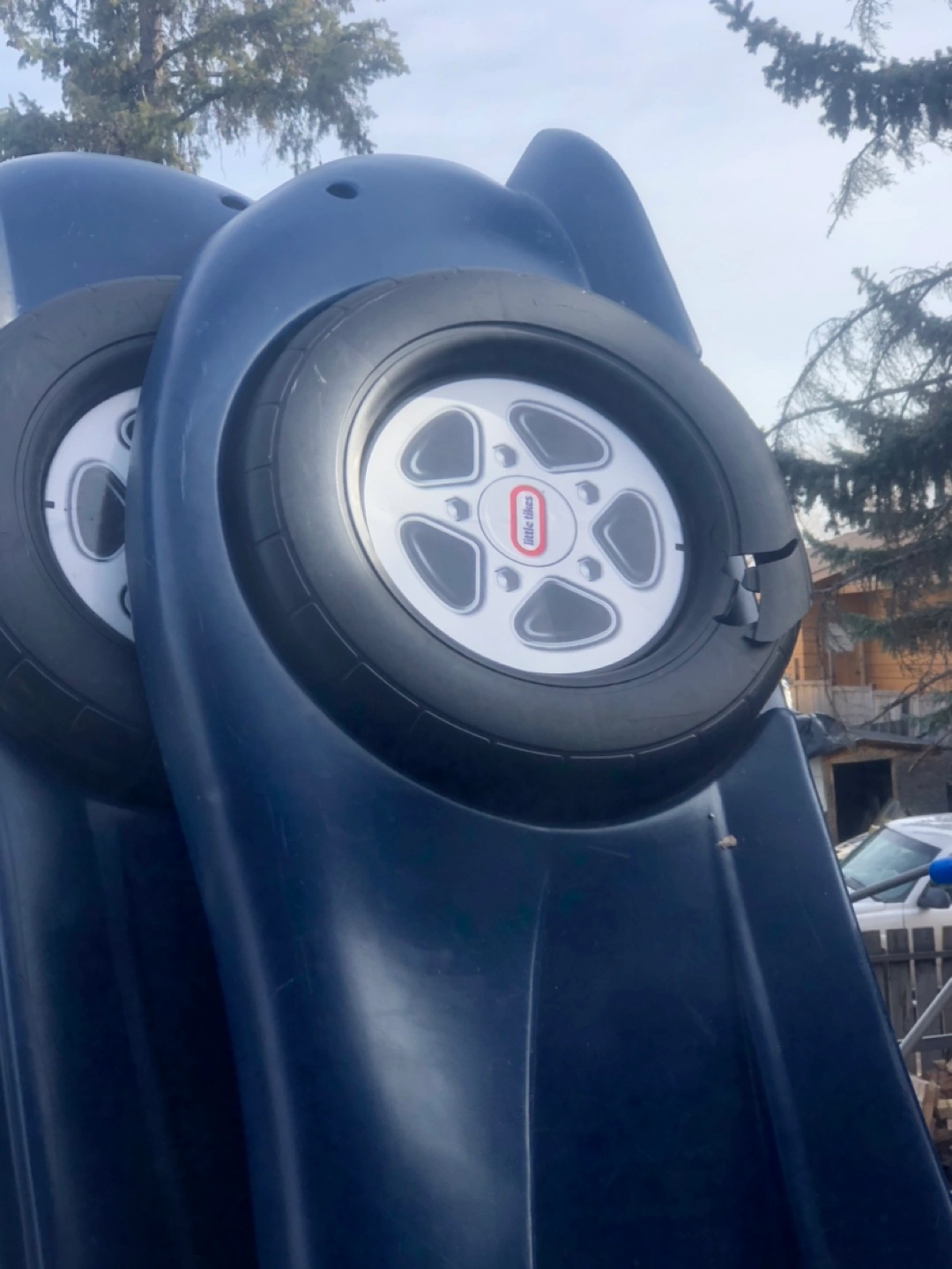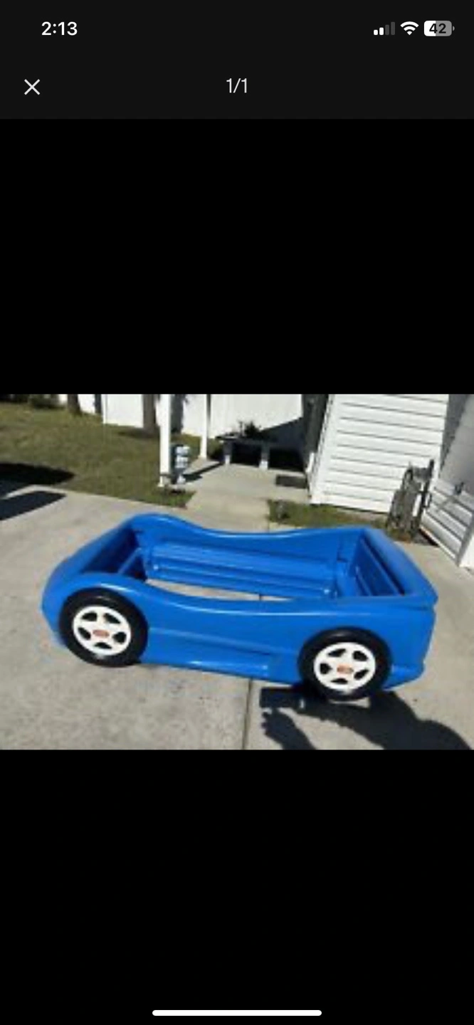 Blue plastic toddler bed. Car shaped. Some wear and tear. Minor damage to one wheel.