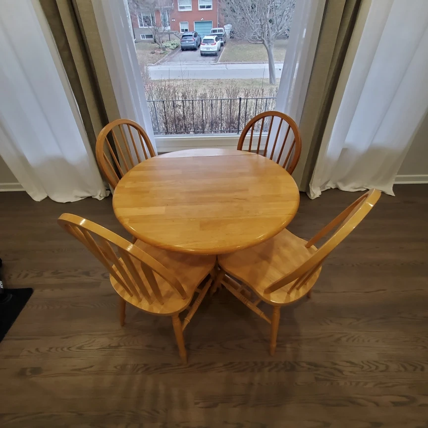 Wooden round table and 4 chairs. Table top is 90 cm in diameter and can be folded down two side for tight space. Table is 60 cm wide after folding both side. Chairs have detachable cushions.