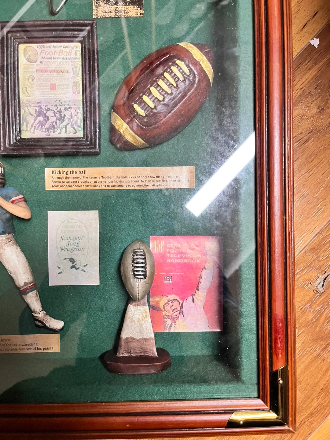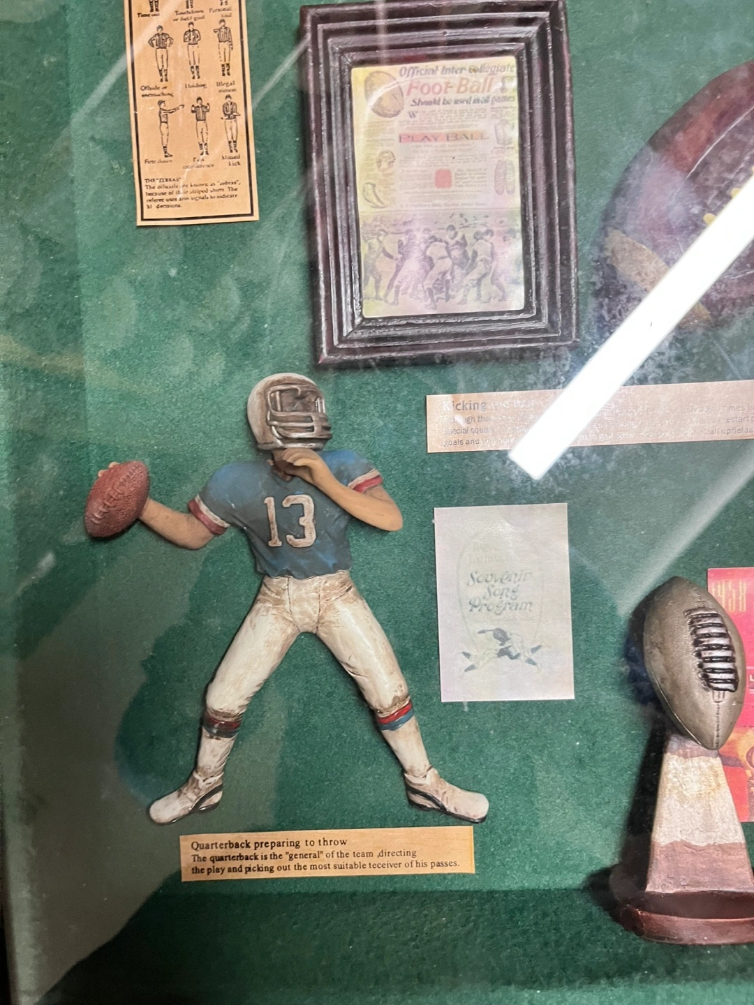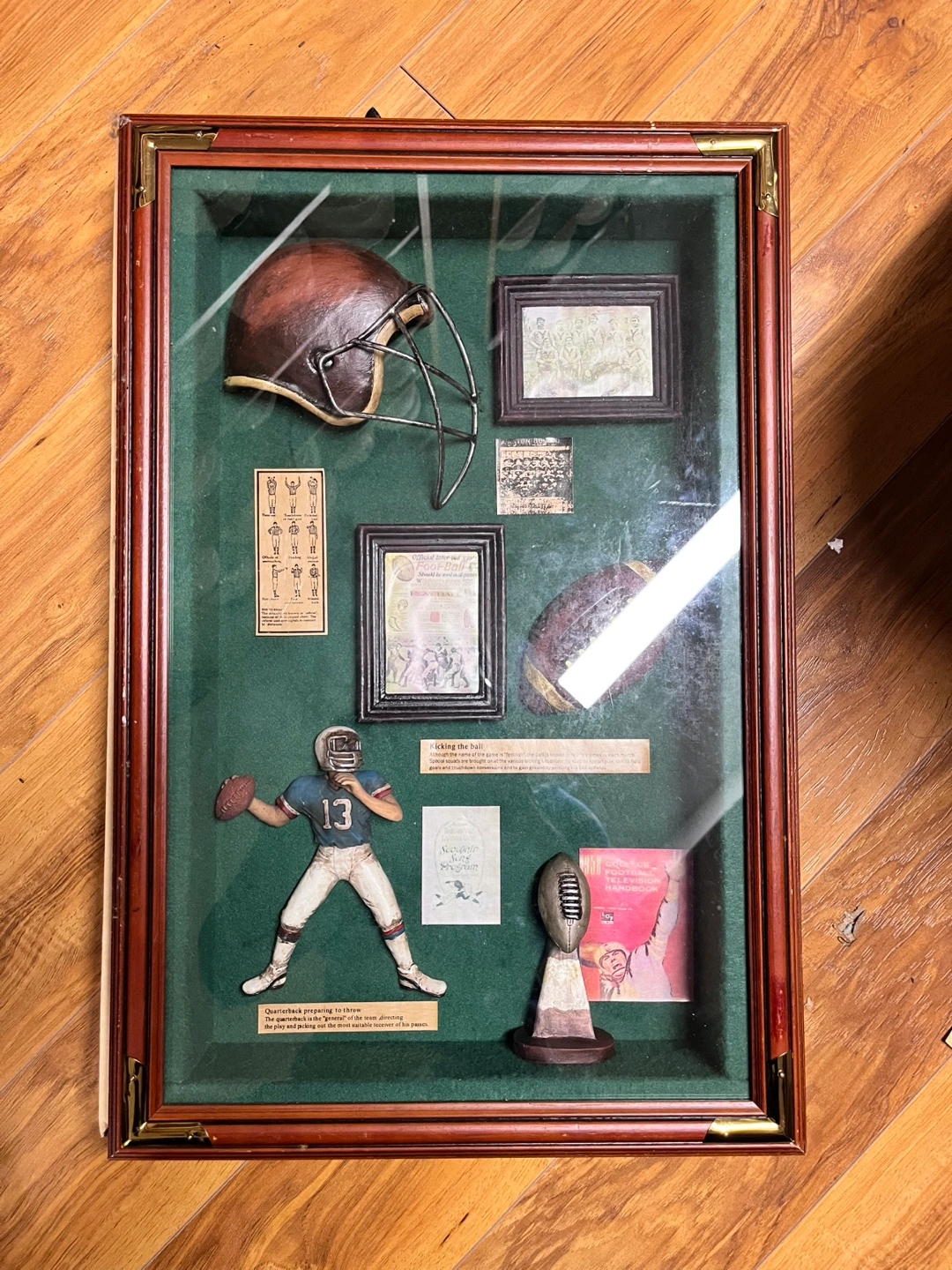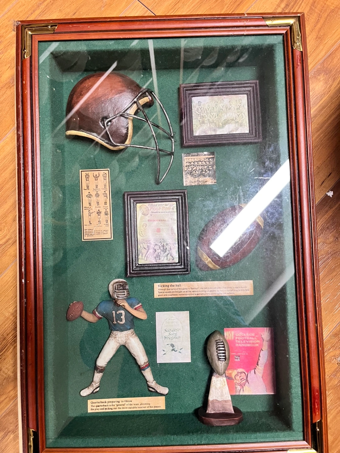 Shadow box features miniature football helmet, footballs, player figurine, and vintage ephemera. Wooden frame. Green felt backing. Great for man cave or sports memorabilia collector.