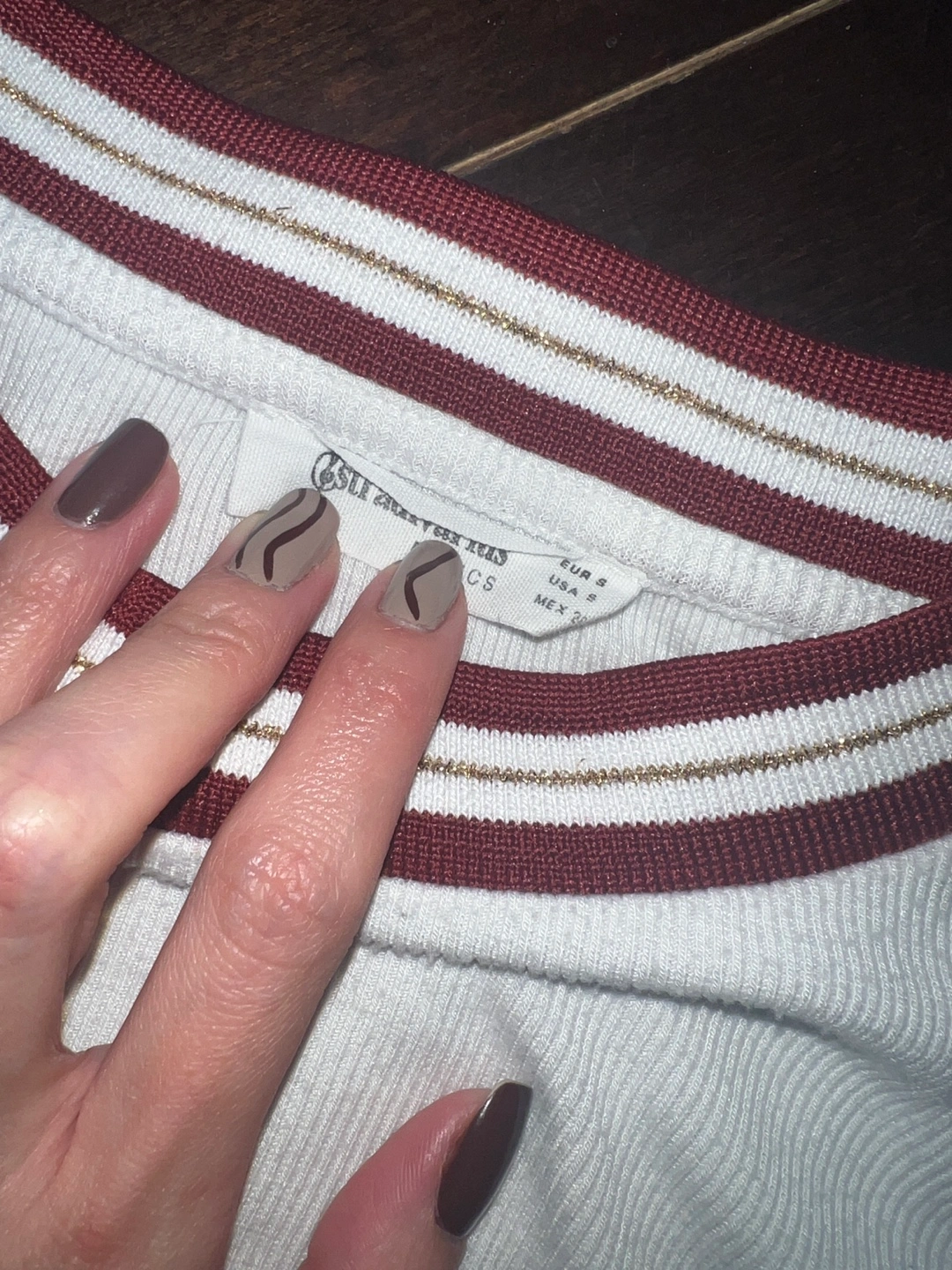 White semi Long-sleeved shirt. Ribbed fabric. Red and gold trim around neckline. Size small. Very stretchy material Pick up only
