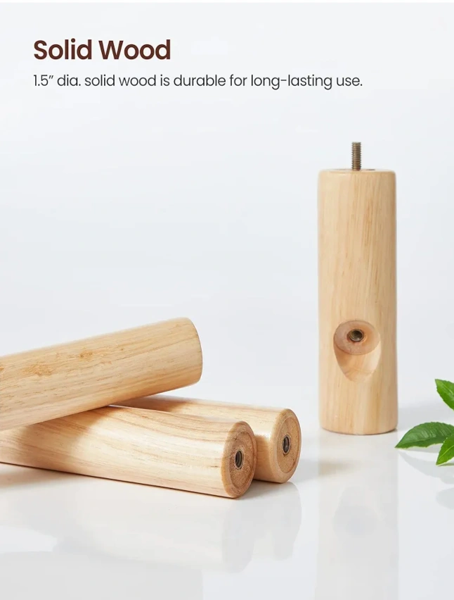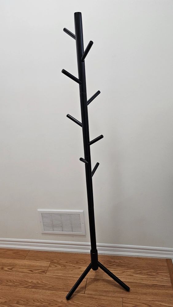Black coat rack. Eight hooks. Stable triangular base. Solid wood construction. Perfect for entryway organization.