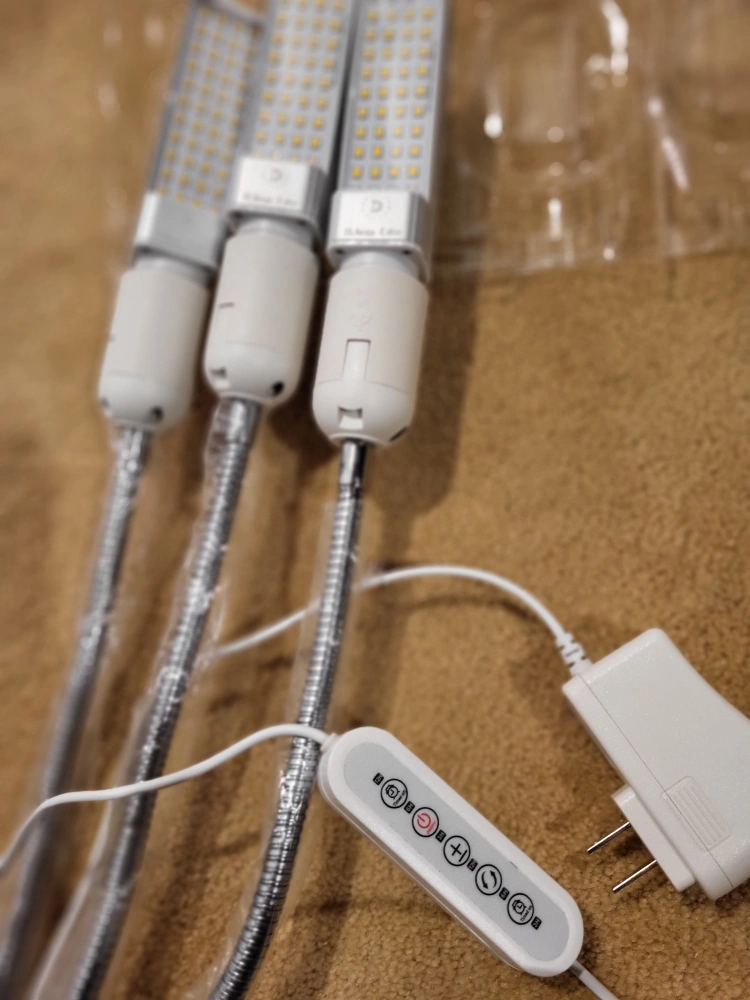Grow light with auto ON/OFF. Has 3 modes and a timer and 3 flexible gooseneck heads. Includes power adapter and clamp. Perfect for starting your garden. For indoor use.