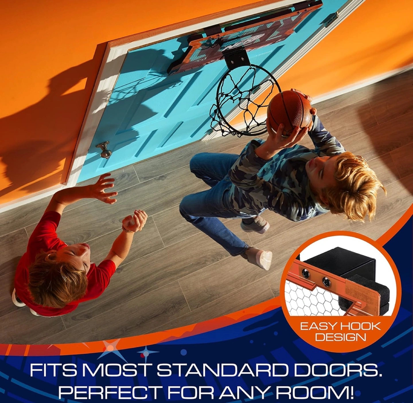 Indoor basketball set. Authentic steel spring-loaded rim. 18" x 12" backboard. Fits most standard doors. Includes basketball. Fun for all ages!