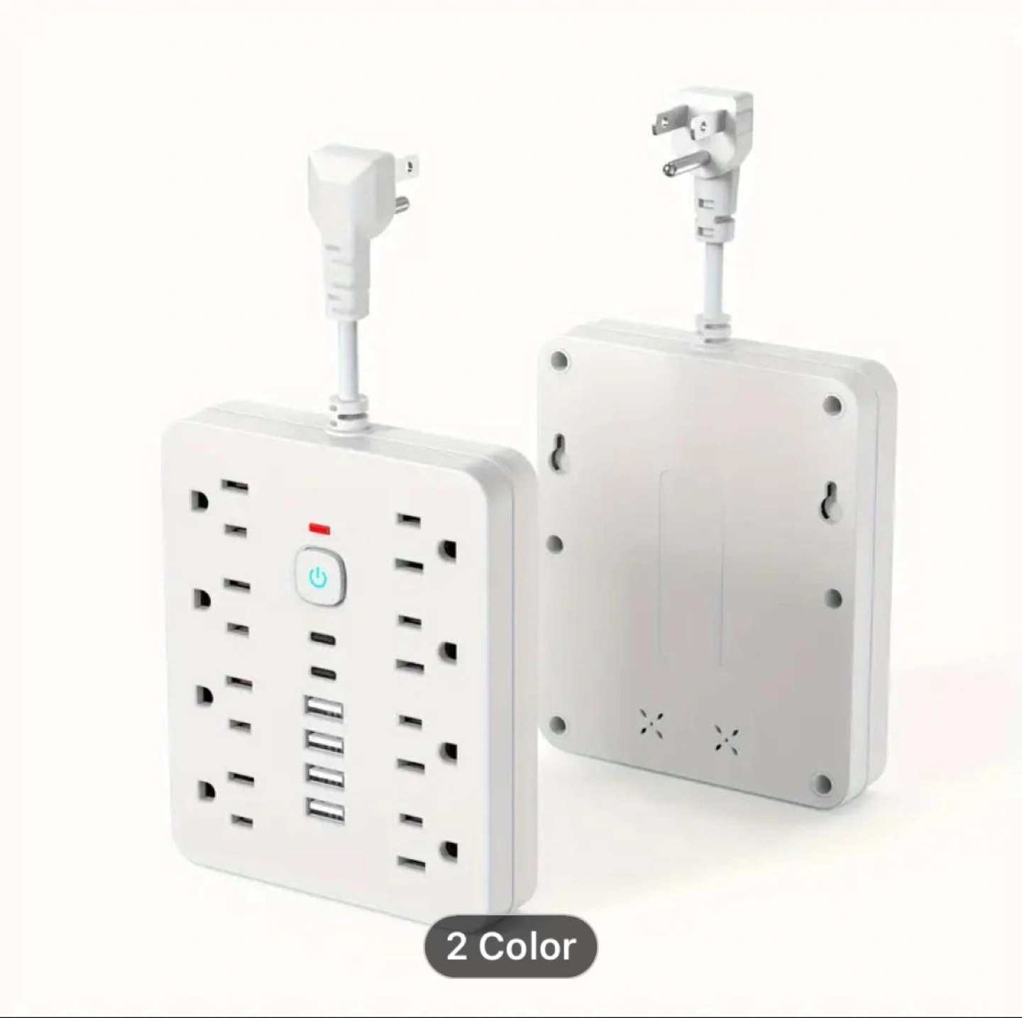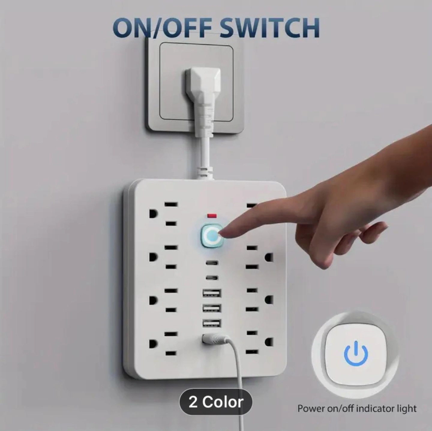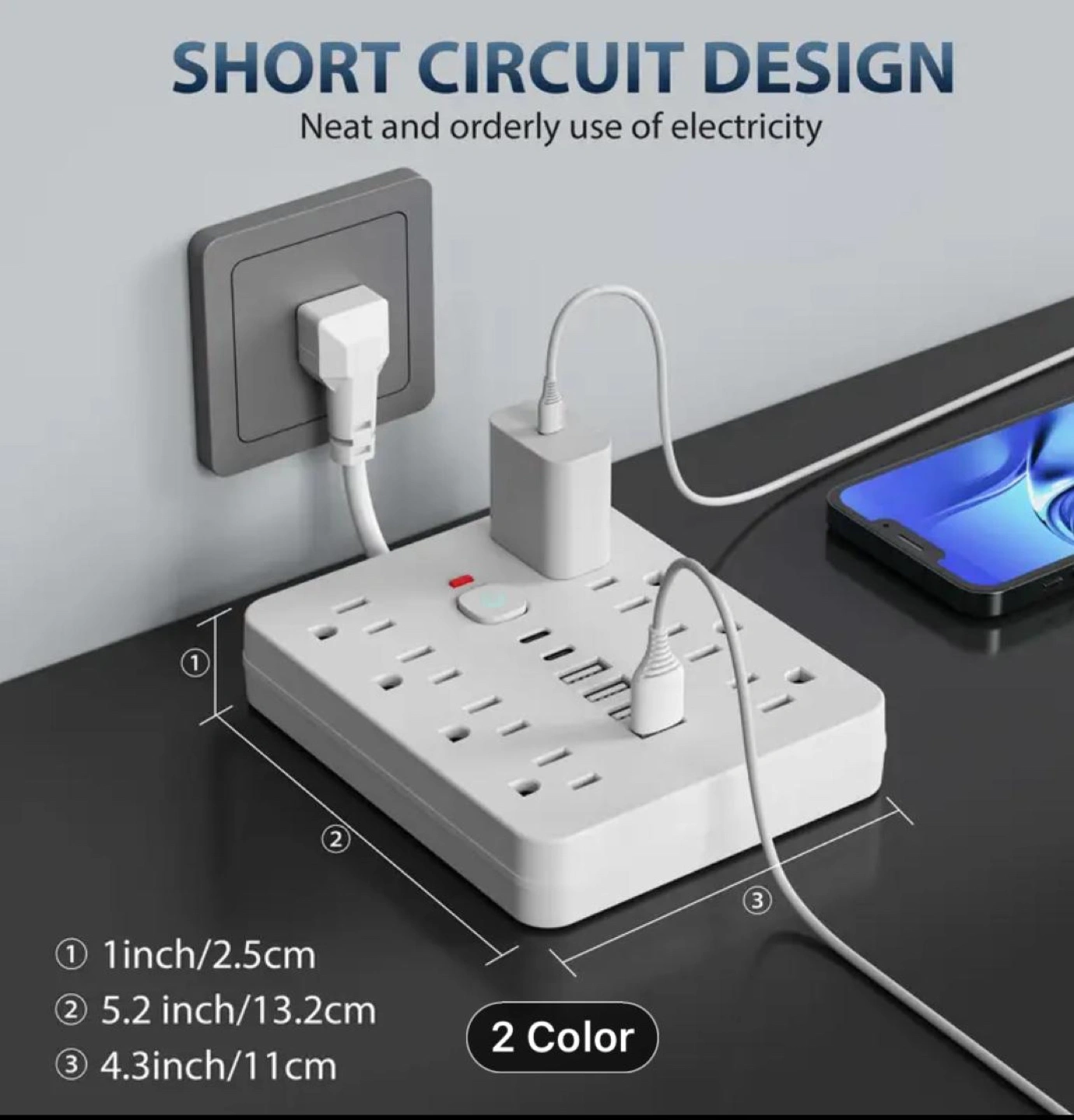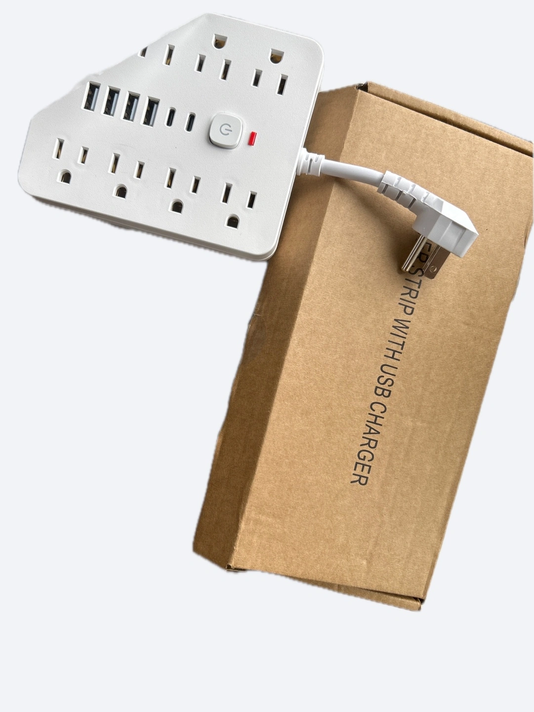 Space-saving power strip. Features multiple AC outlets and USB charging ports. Overload protection. On/off switch with indicator light. Compact design.