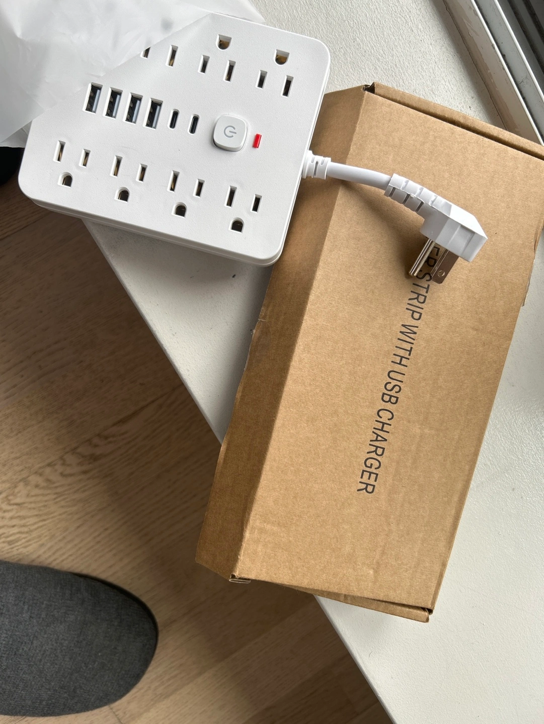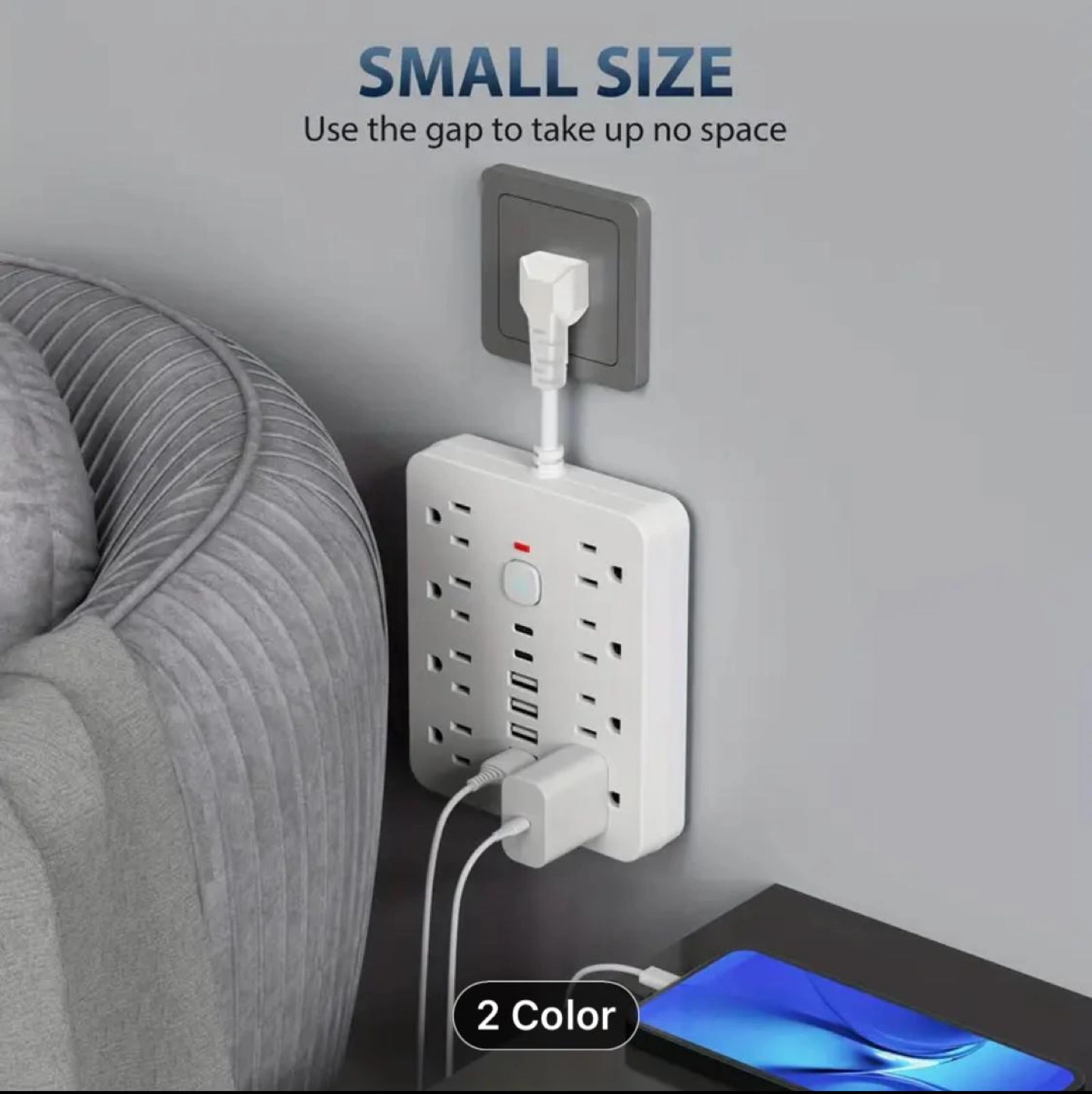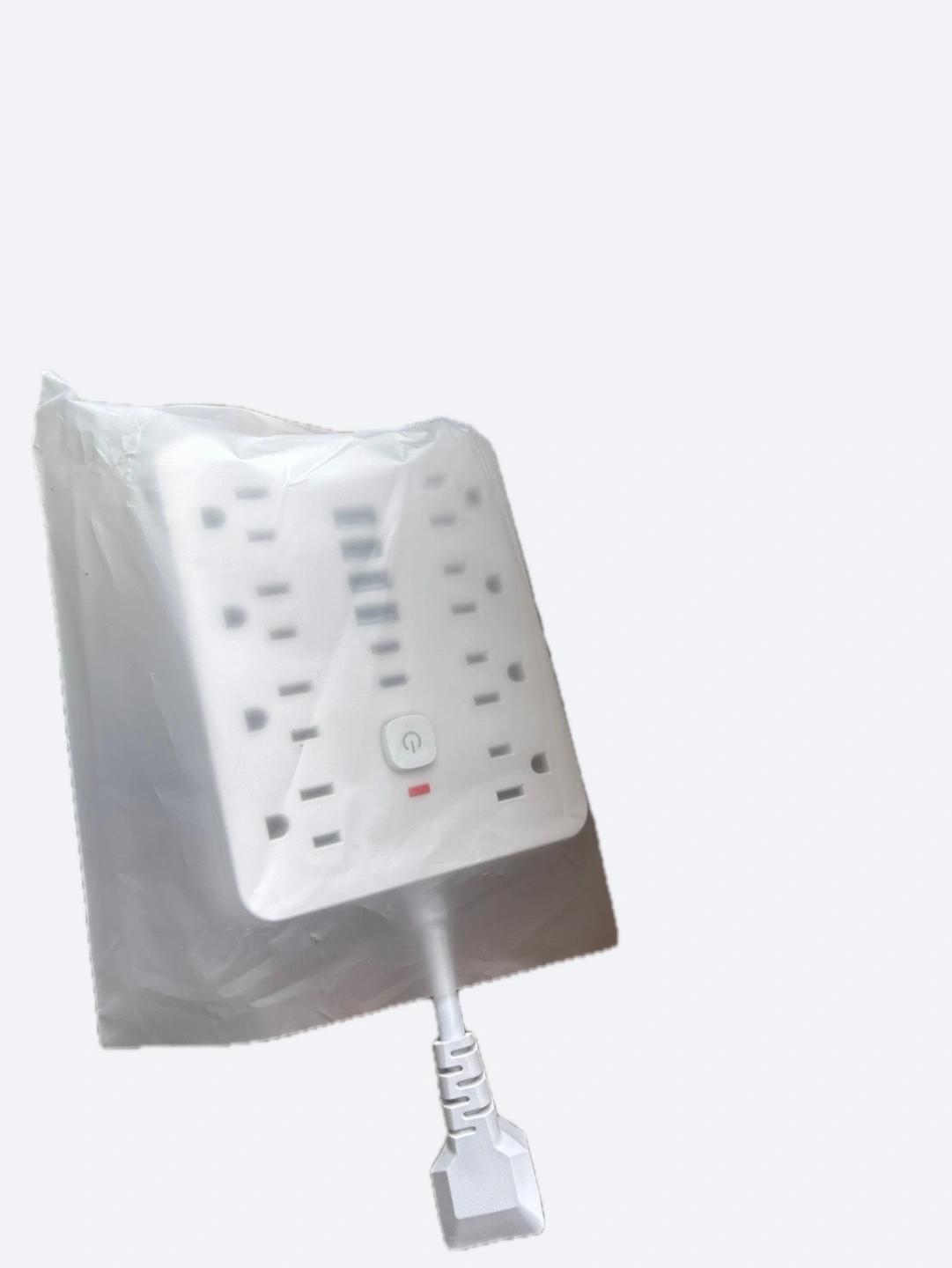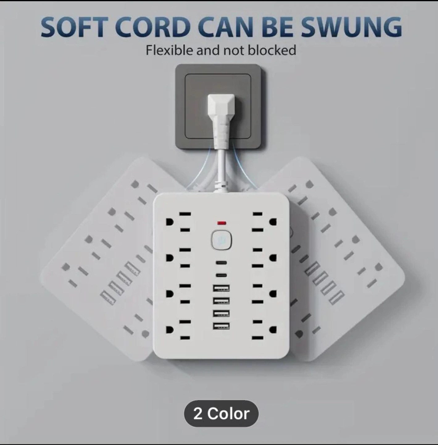 Space-saving power strip. Features multiple AC outlets and USB charging ports. Overload protection. On/off switch with indicator light. Compact design.