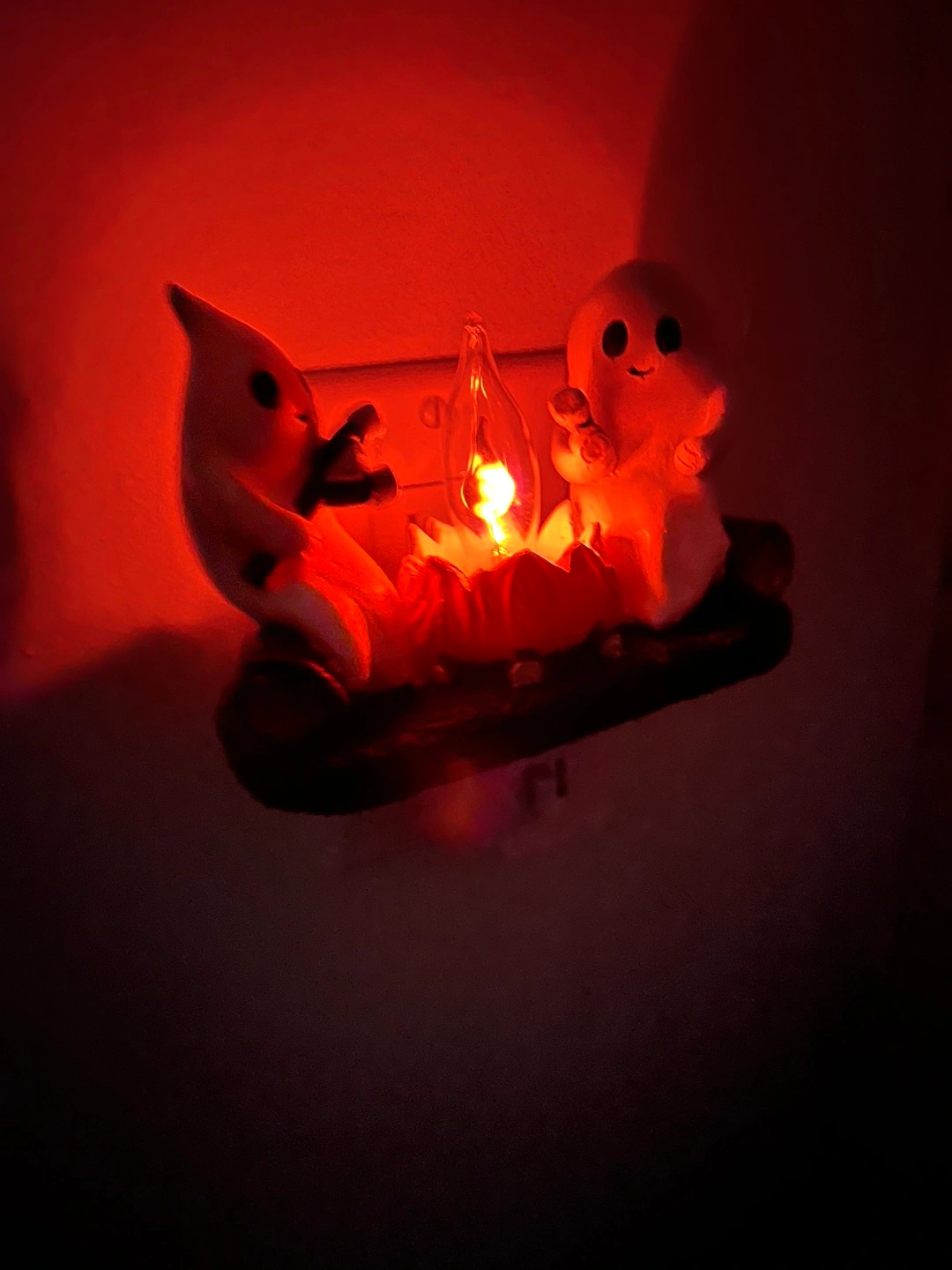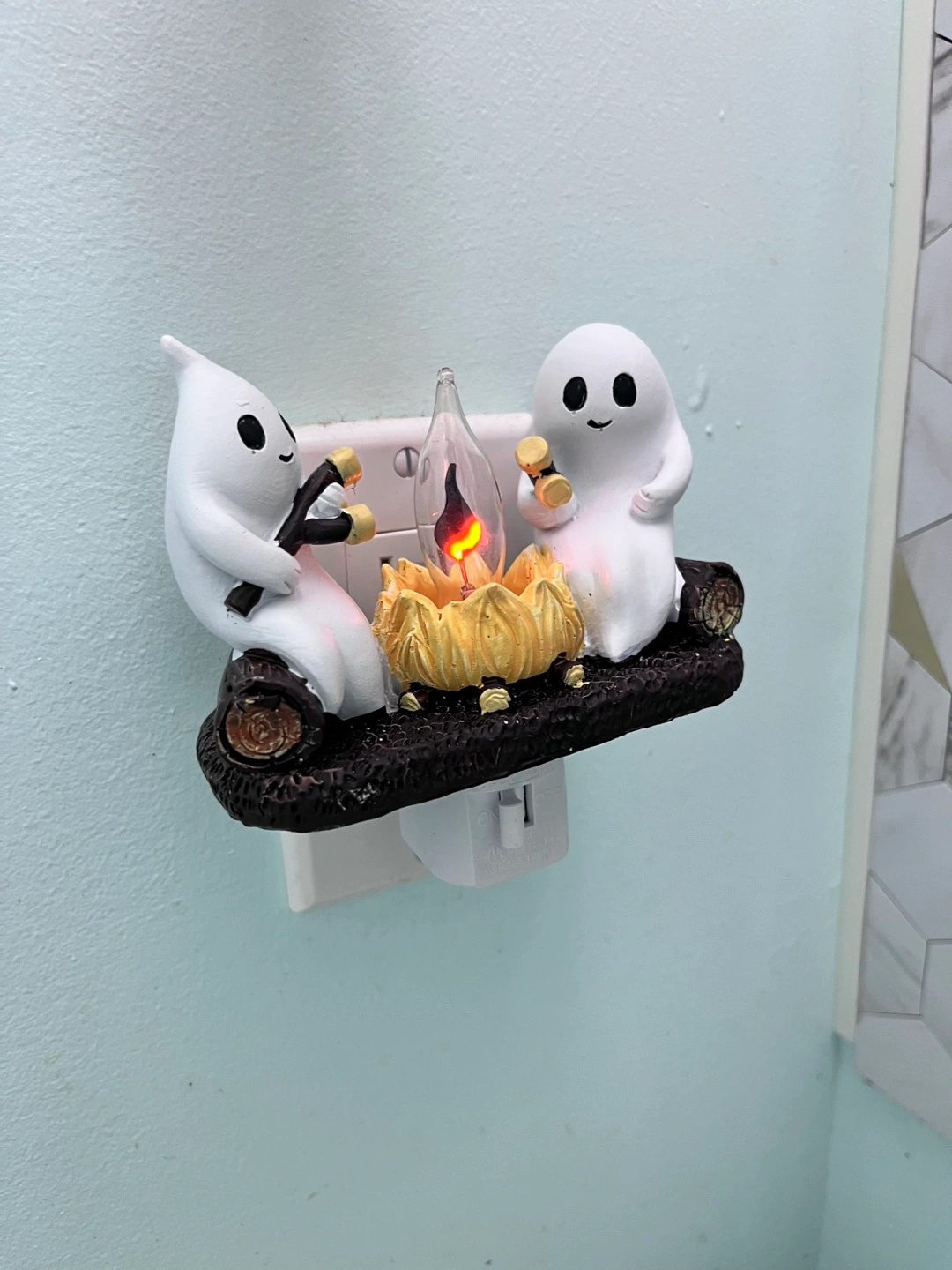 106Cute Halloween night light. Features two friendly ghosts roasting marshmallows around a campfire. Perfect for kids' rooms or spooky season decor. Plugs directly into an outlet.