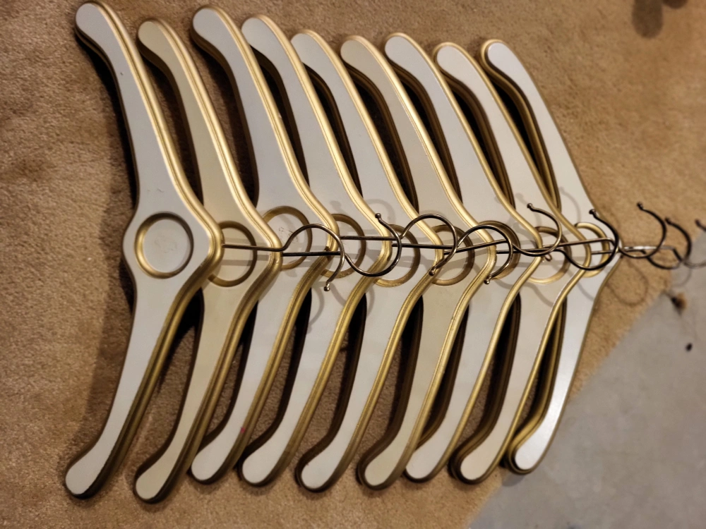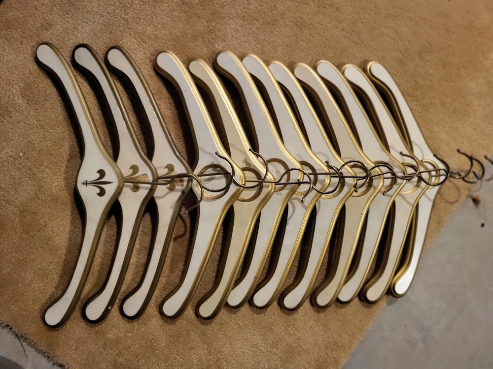 12 vintage wooden hangers. Gold and off-white colour. Fleur-de-lis detail on 3. Circle for Inital or logo on 9. Gold coloured metal hooks. Unique design. Ideal for a boutique or vintage clothing store. Good for heavy coats.