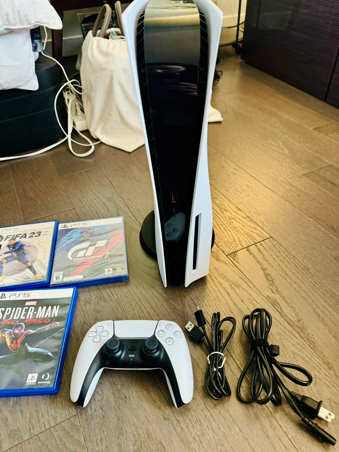 PlayStation 5 console, DualSense controller, power cable, USB cable. Five PlayStation 5 games included: FIFA 23, Gran Turismo 7, Ratchet & Clank: Rift Apart, Marvel's Spider-Man: Miles Morales, Death Stranding Director's Cut.