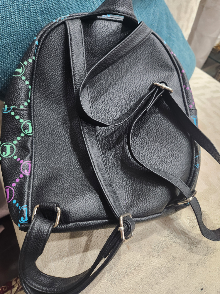 Black mini backpack. Features Justice branding and a repeating logo pattern. Includes a detachable pink pom-pom charm. Adjustable straps. Zipper closure.