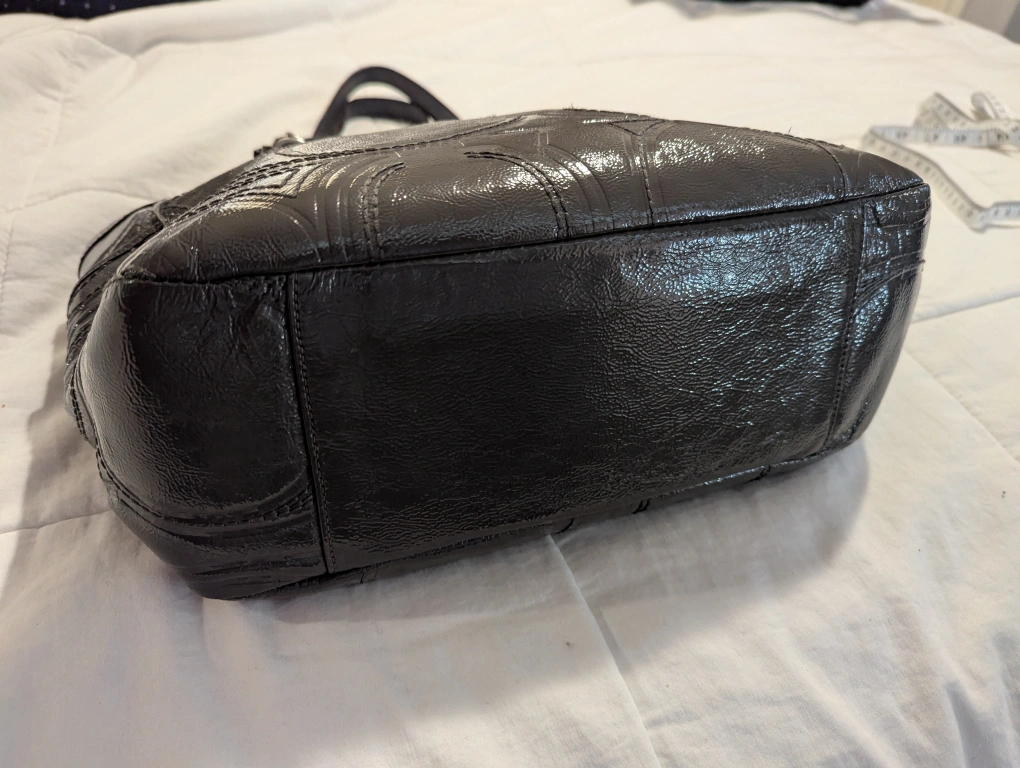 Gun metal grey patent leather bag. Features Coach logo pattern. Purple lining with 3 interior pockets. No staining or scratches. Pre-owned.