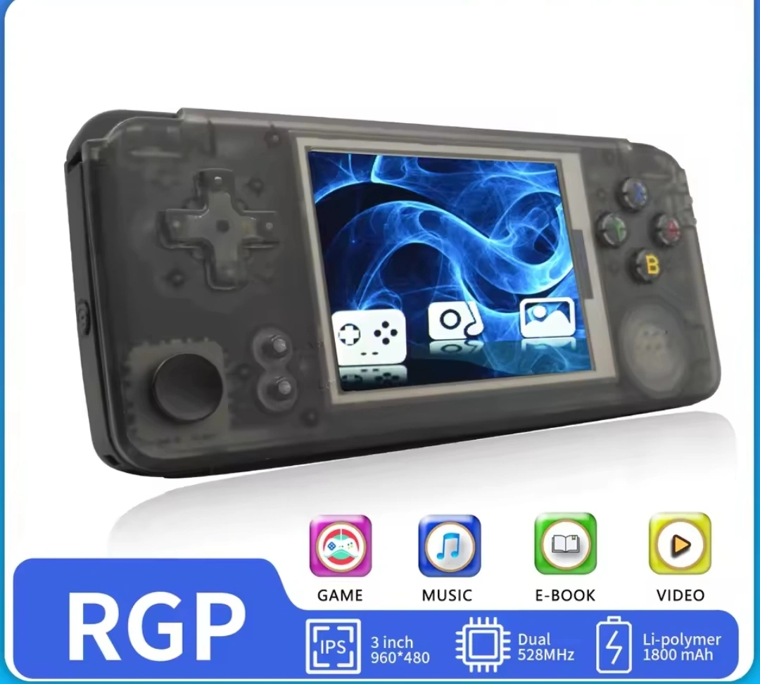 3 inch IPS screen. Plays games, music, ebooks, and videos. Features a 1800 mAh battery, lasting six hours. Includes 360 degree control. Transparent casing. External BL-5B battery.