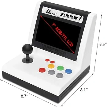 Retro-styled handheld arcade game console. Features joystick and multiple buttons. Compact and portable design. Plays various classic arcade games.