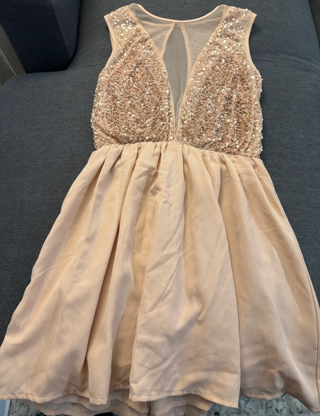 Gorgeous champagne-colored mini dress. Features a sequined bodice and sheer back. Fit-and-flare silhouette. Perfect for a special occasion.