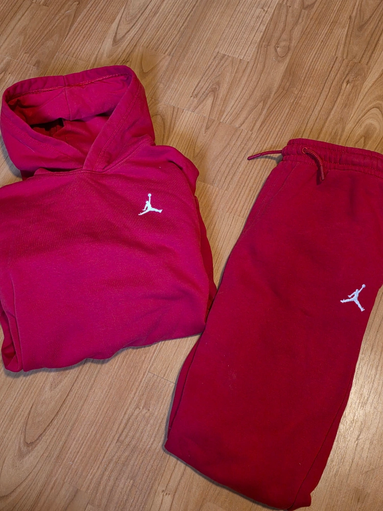 Red Jordan Brand tracksuit. Includes a hoodie and joggers. Small Jumpman logo on both pieces. Great for casual wear. youth xl