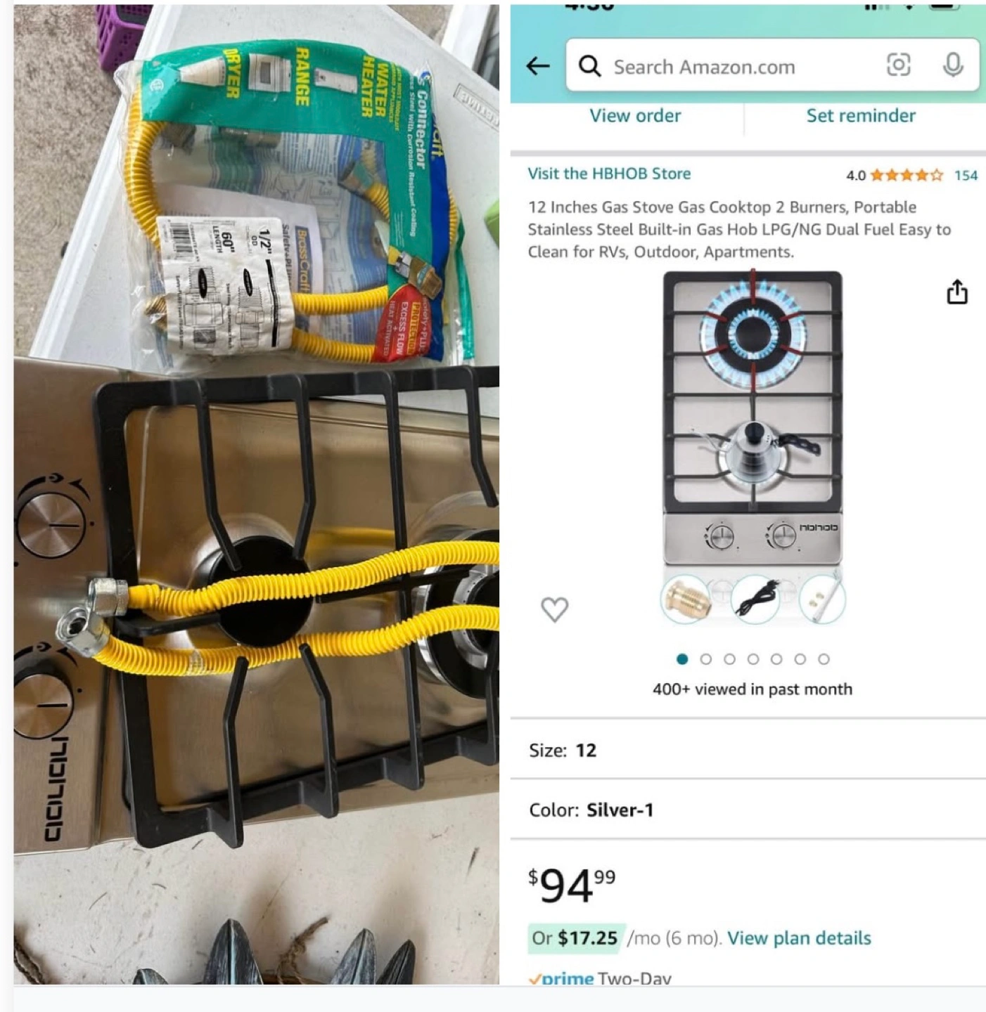 12 inch portable gas cooktop. Two burners. Stainless steel. Dual fuel (LPG/NG). Easy to clean. Includes gas line.