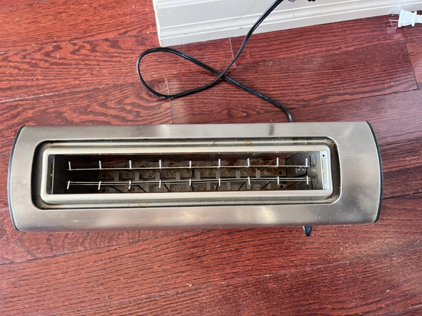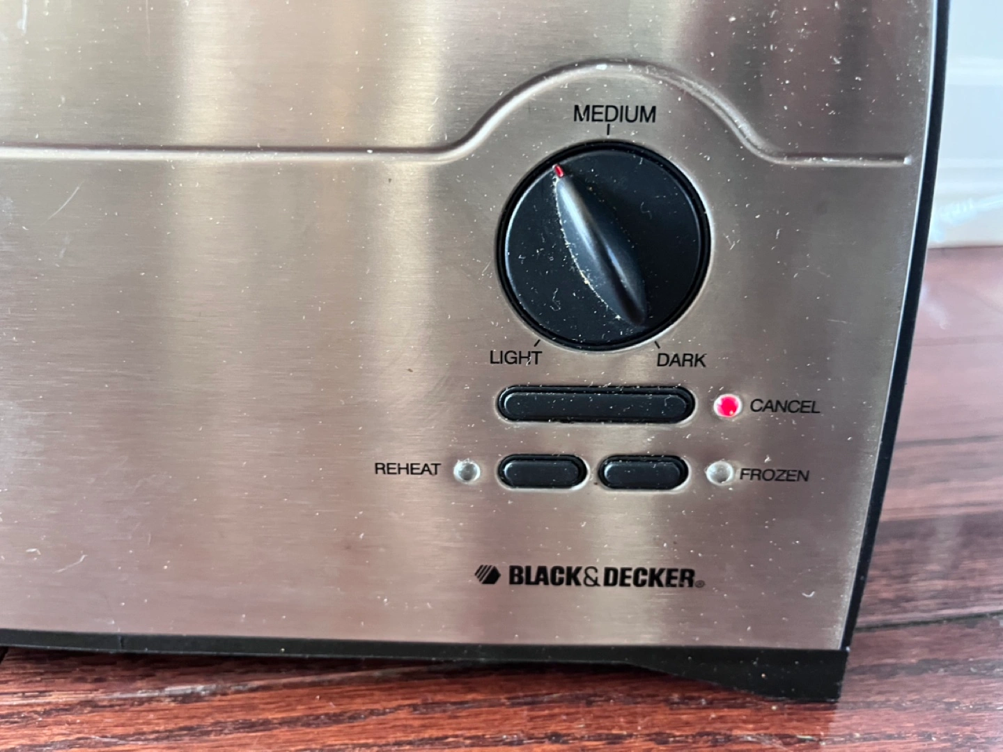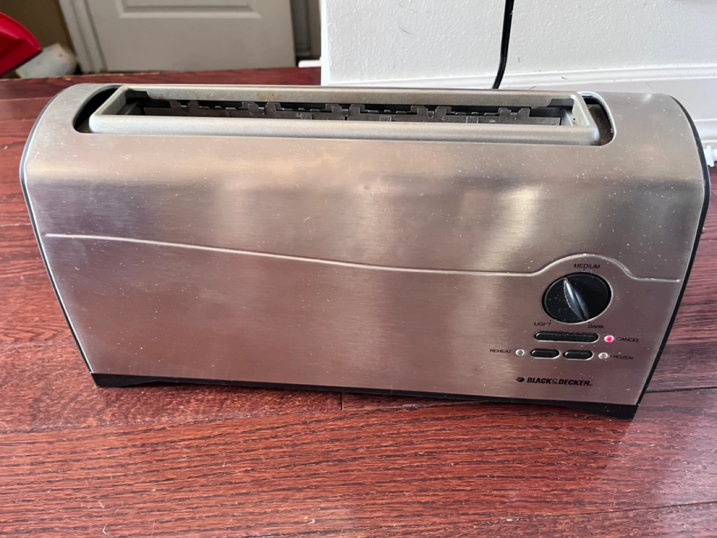 Stainless steel toaster. Two slices. Features light, medium, dark toasting options. Reheat and frozen settings. Cancel button included. Used condition.