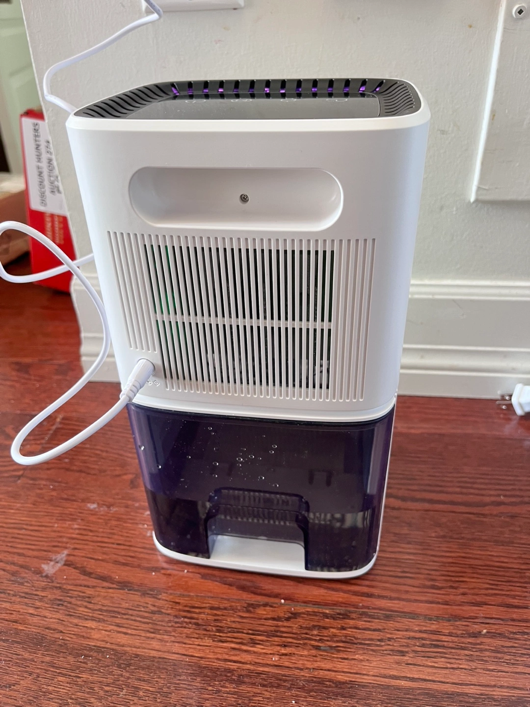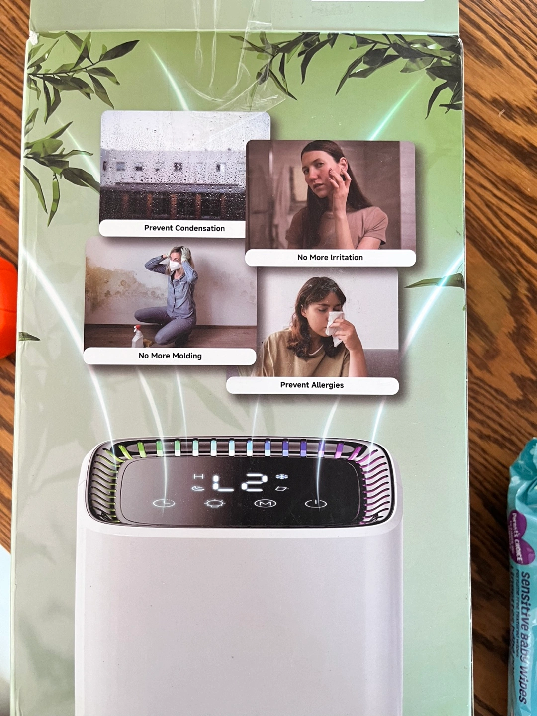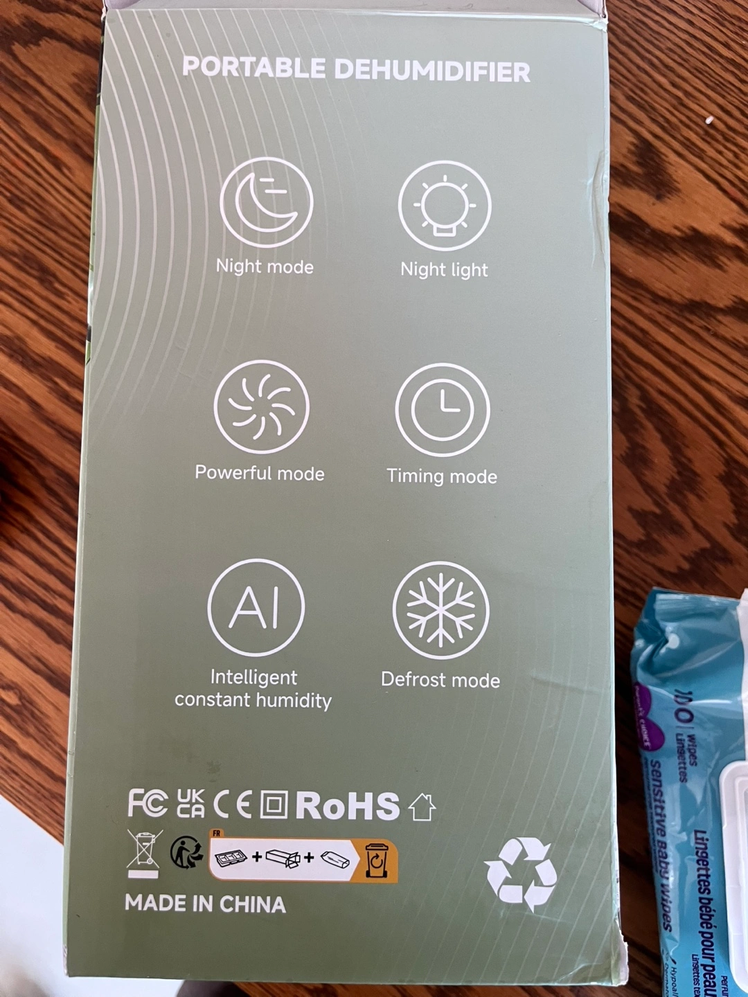Small portable dehumidifier. Features night mode, night light, powerful mode, timing mode, intelligent constant humidity, and defrost mode. Made in China.