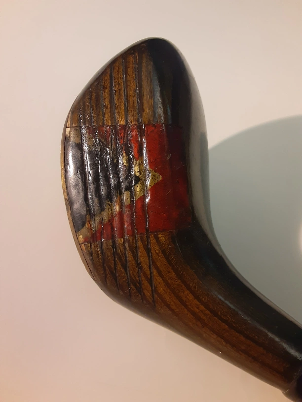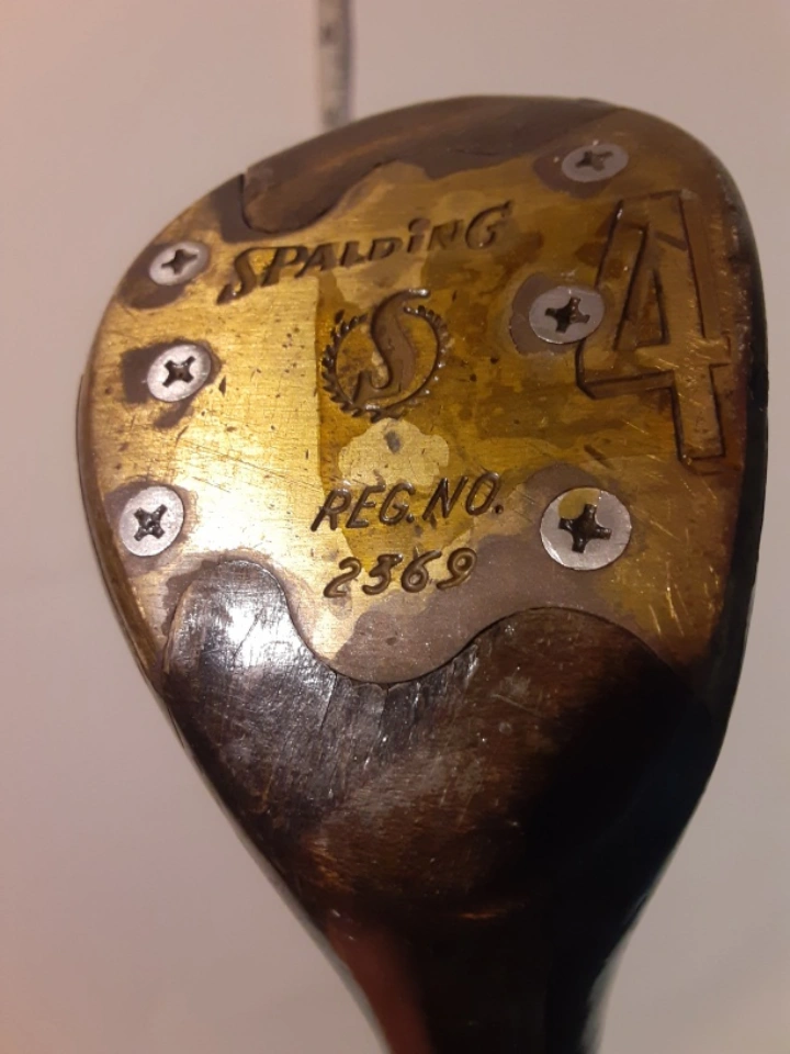 Antique golf club. Wood number 4. Spalding brand. Right handed. Shows wear consistent with age. Shaft measures approximately 44 inches. Brass plate on club face. Unique design elements.