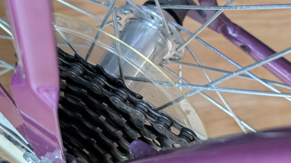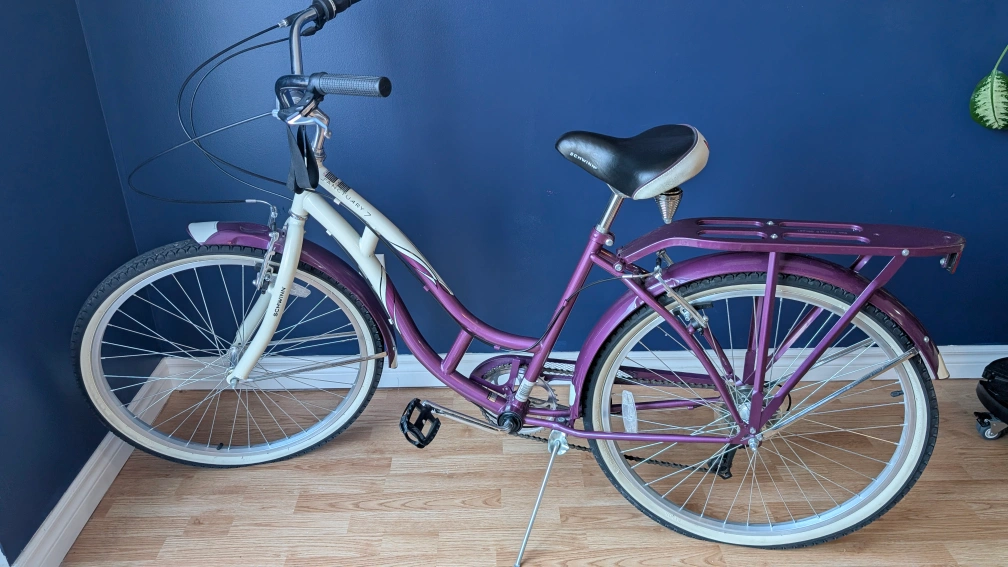 Purple and cream women's cruiser bike with rear carrier. Like new, used for maybe 5 rides in the neighbourhood. Rear tire may need some service, it appears to lose air faster than the front. Retail $360.