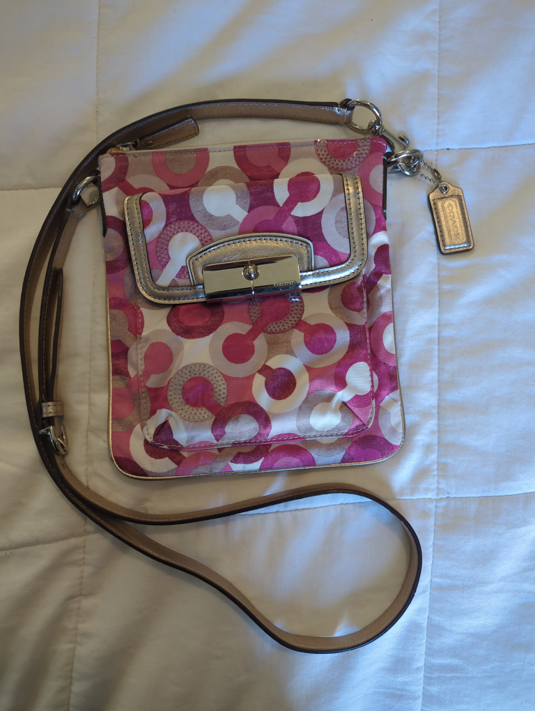 Adorable Coach crossbody bag. Pink, silver, and white circle pattern. Adjustable silver leather strap. Great for everyday use.