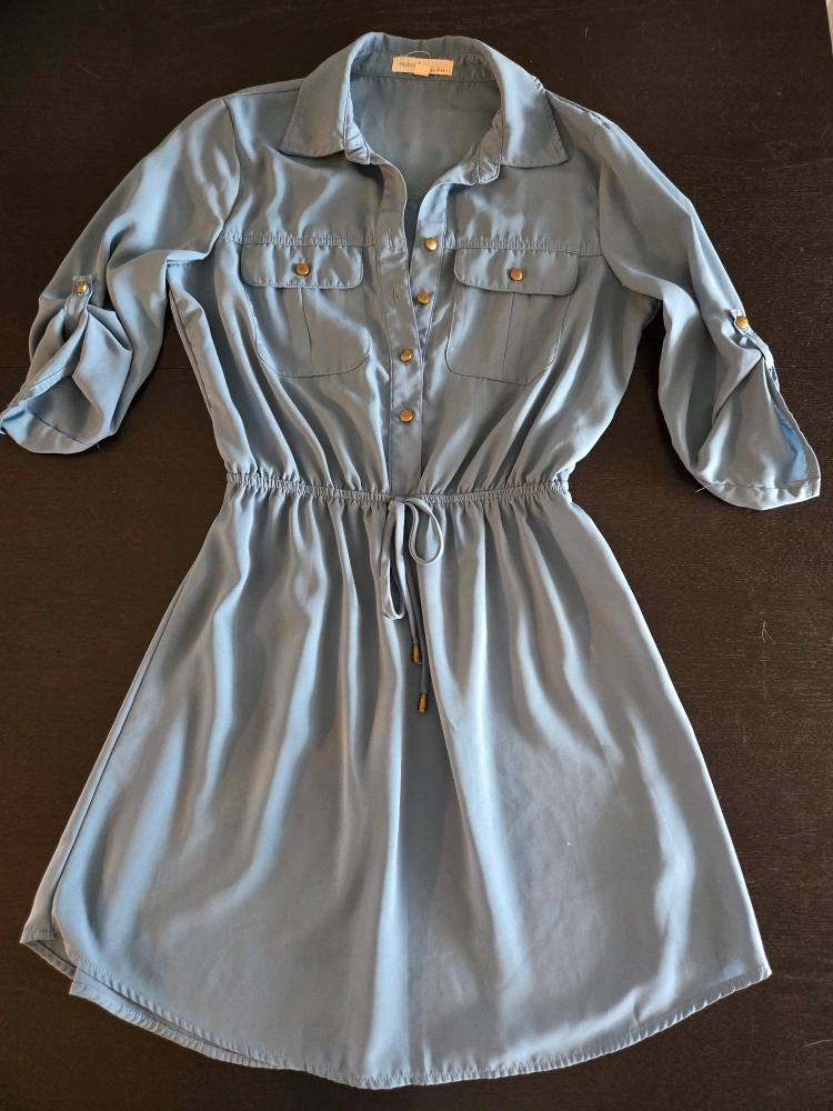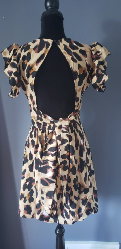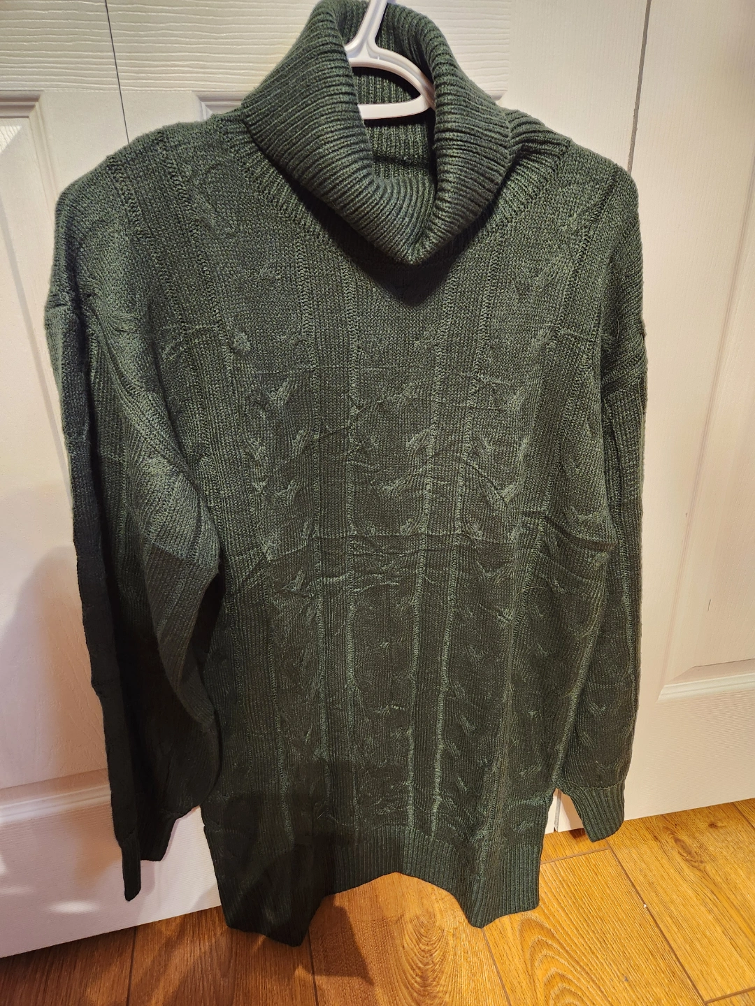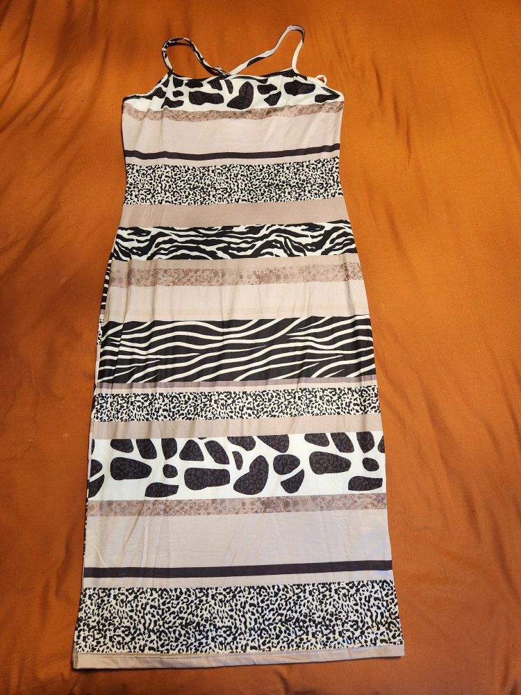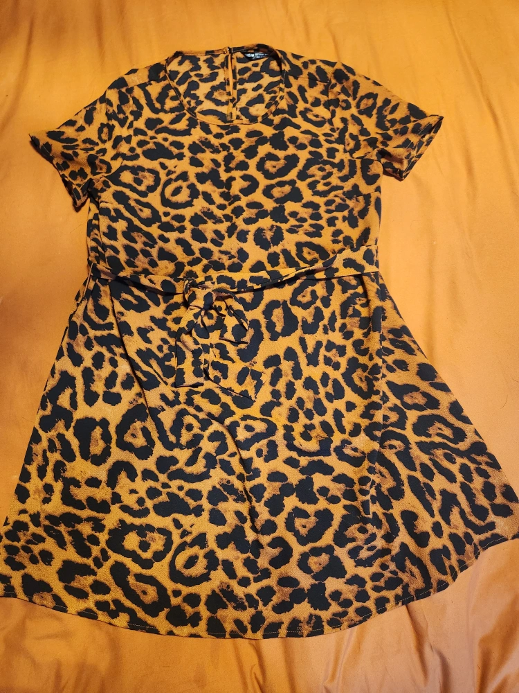 Includes a dark green cable knit turtleneck sweater (new), a leopard dress with belt, a light blue shirt dress (medium), animal print pink midi dress (new), black and white striped dress from Dynamite and a leopard dress with open back.
