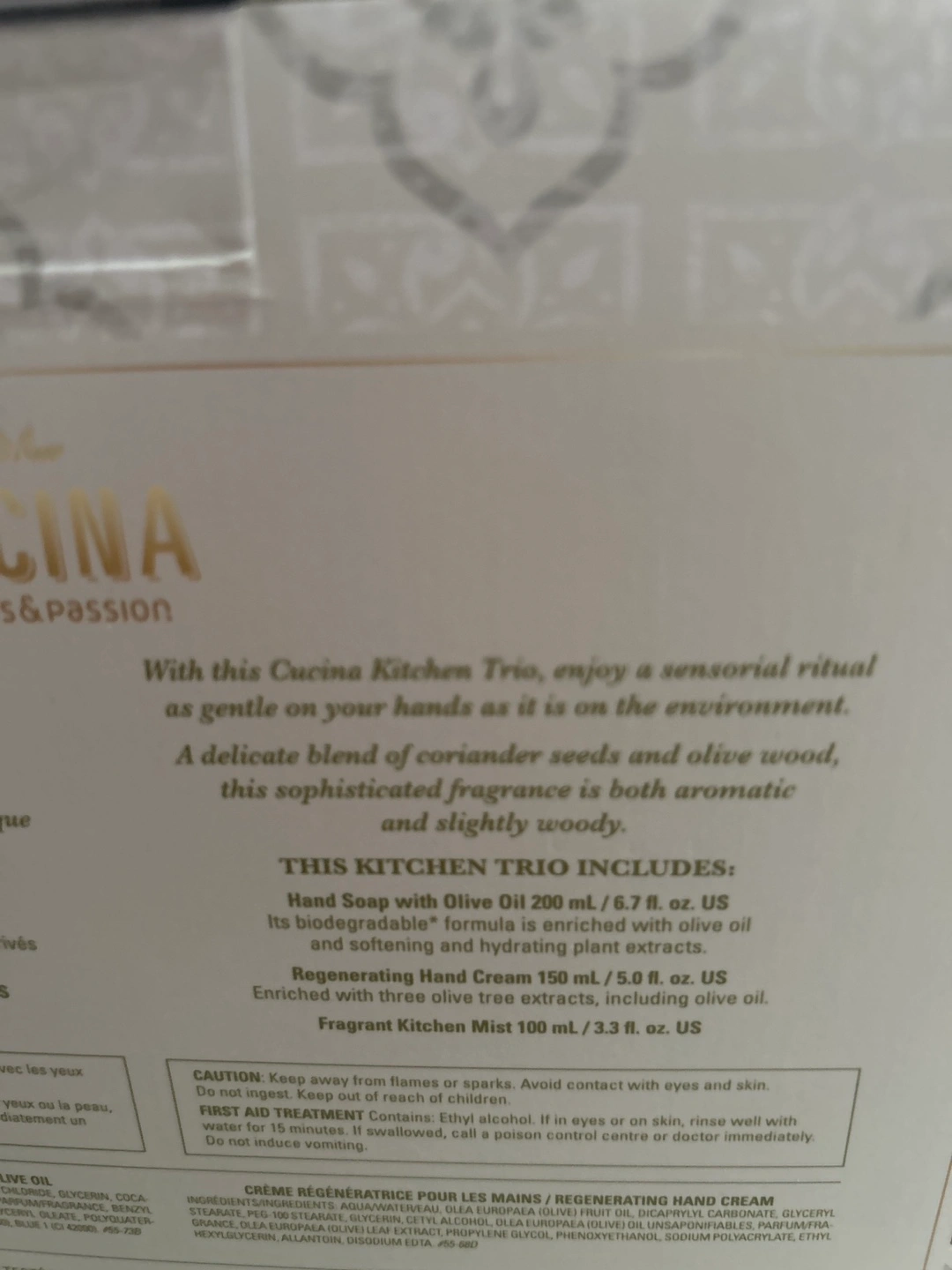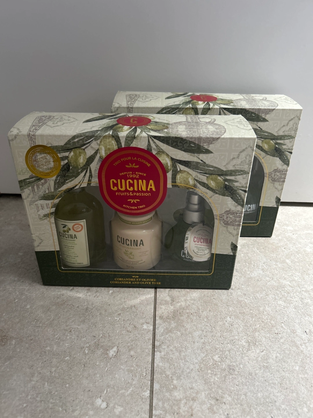Two Cucina Kitchen Trios. New, unopened gift sets. Each includes ceramic containers, hand soap, hand cream, and fragrant mist. Coriander and olive tree scent.