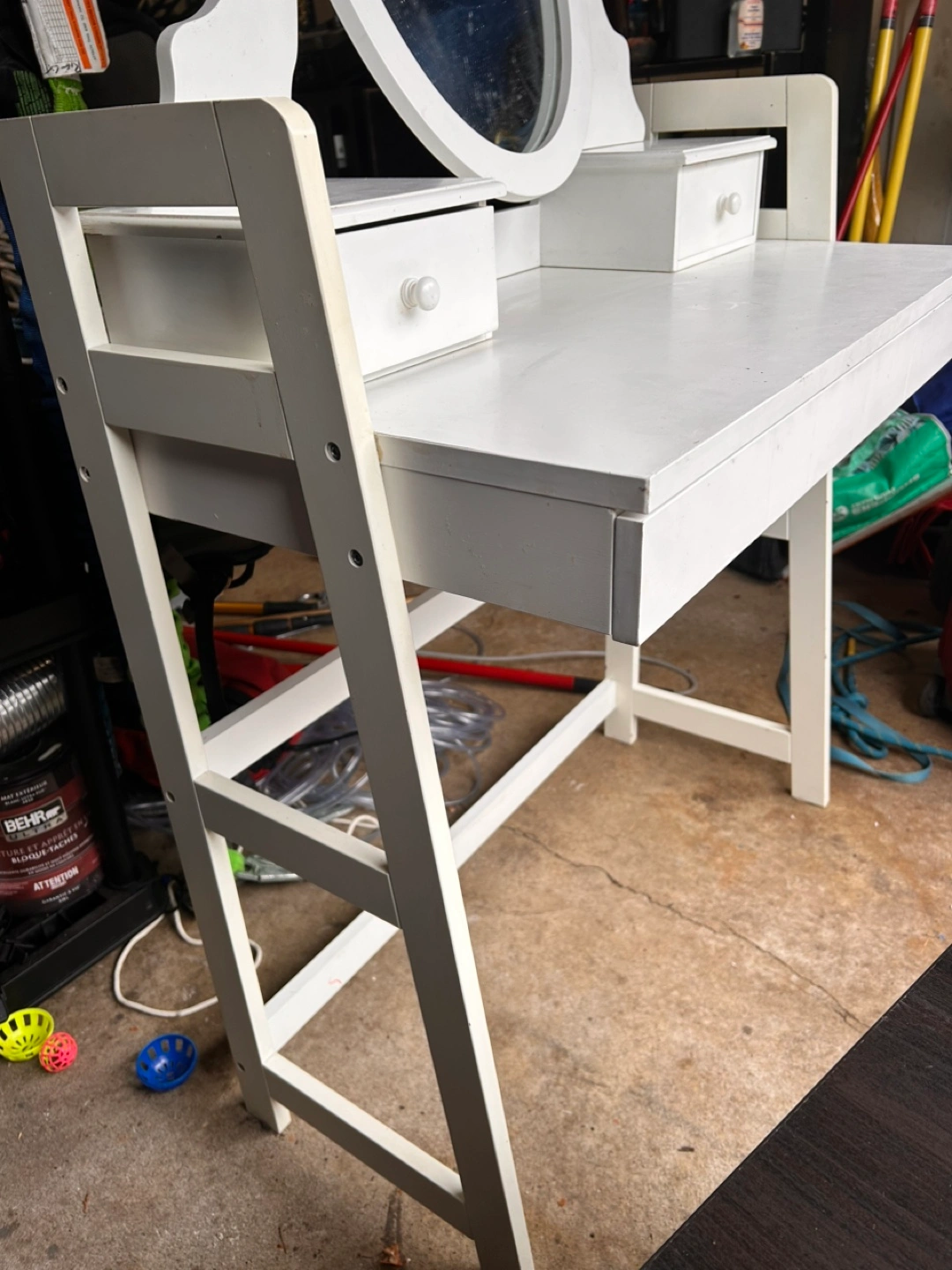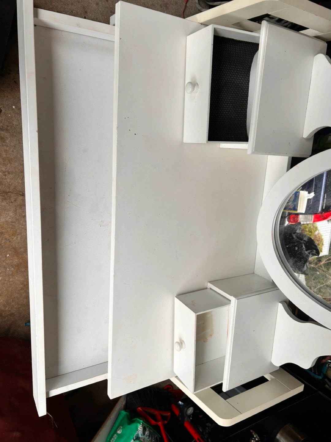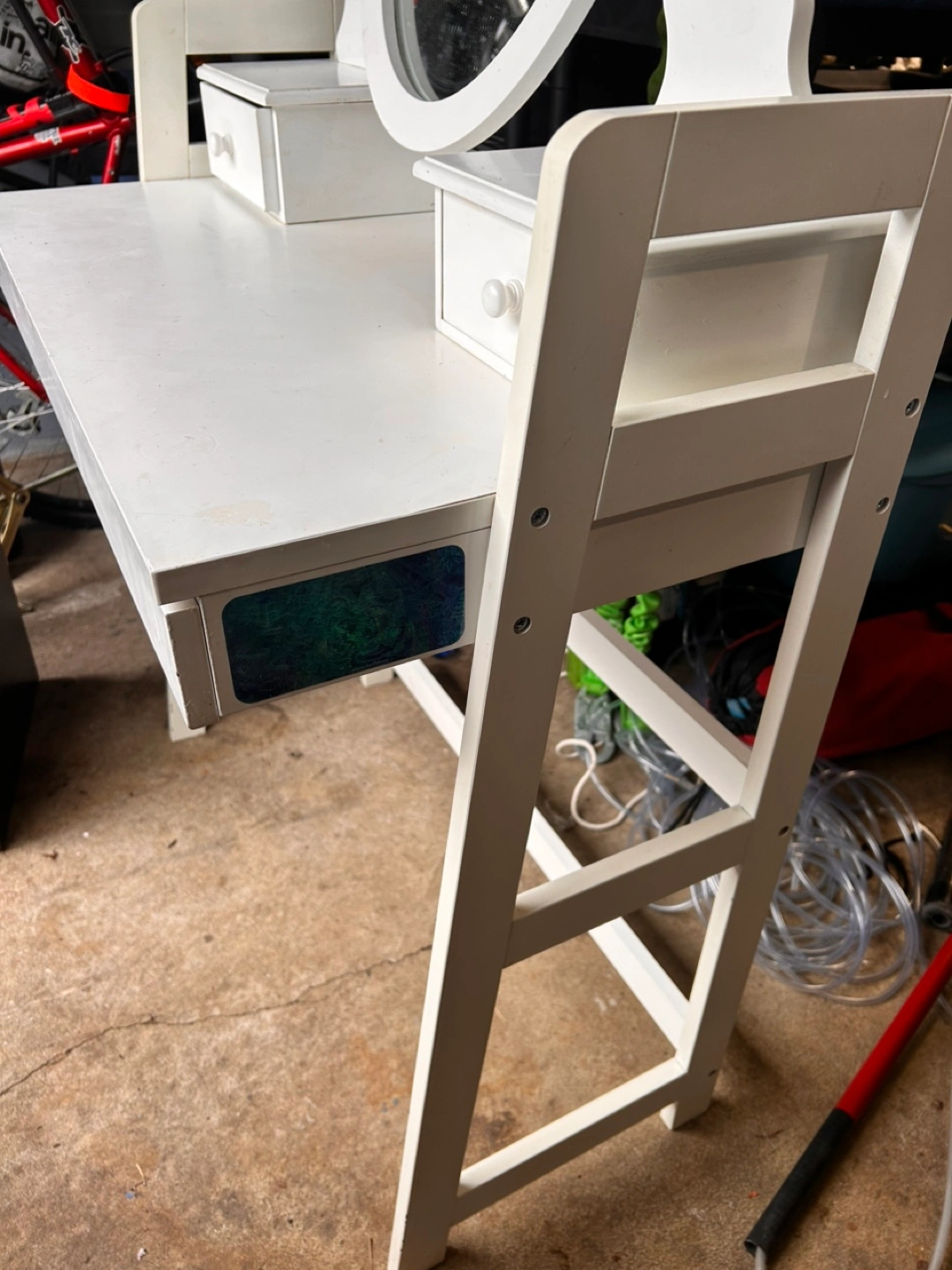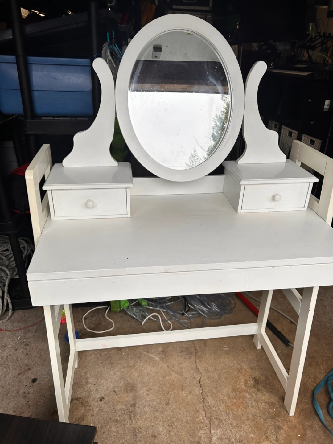 White vanity desk with oval mirror and three drawers. Structurally sound, but with cosmetic flaws, i.e. stains. One sticker on the side. Mirror and top drawers are detached.