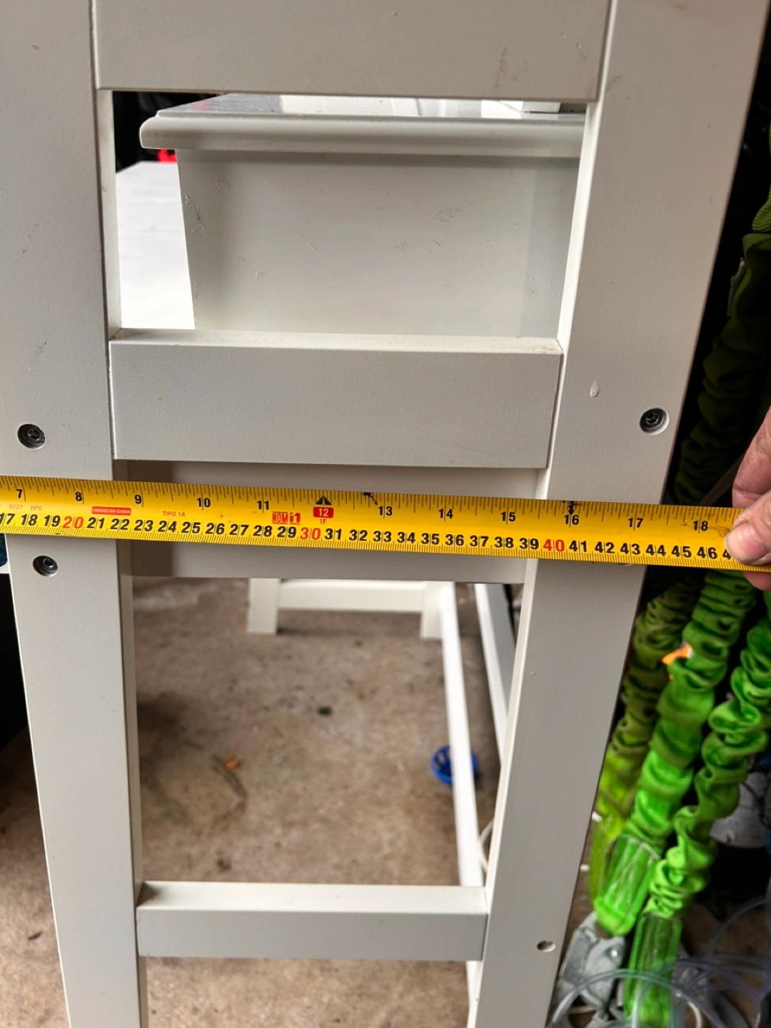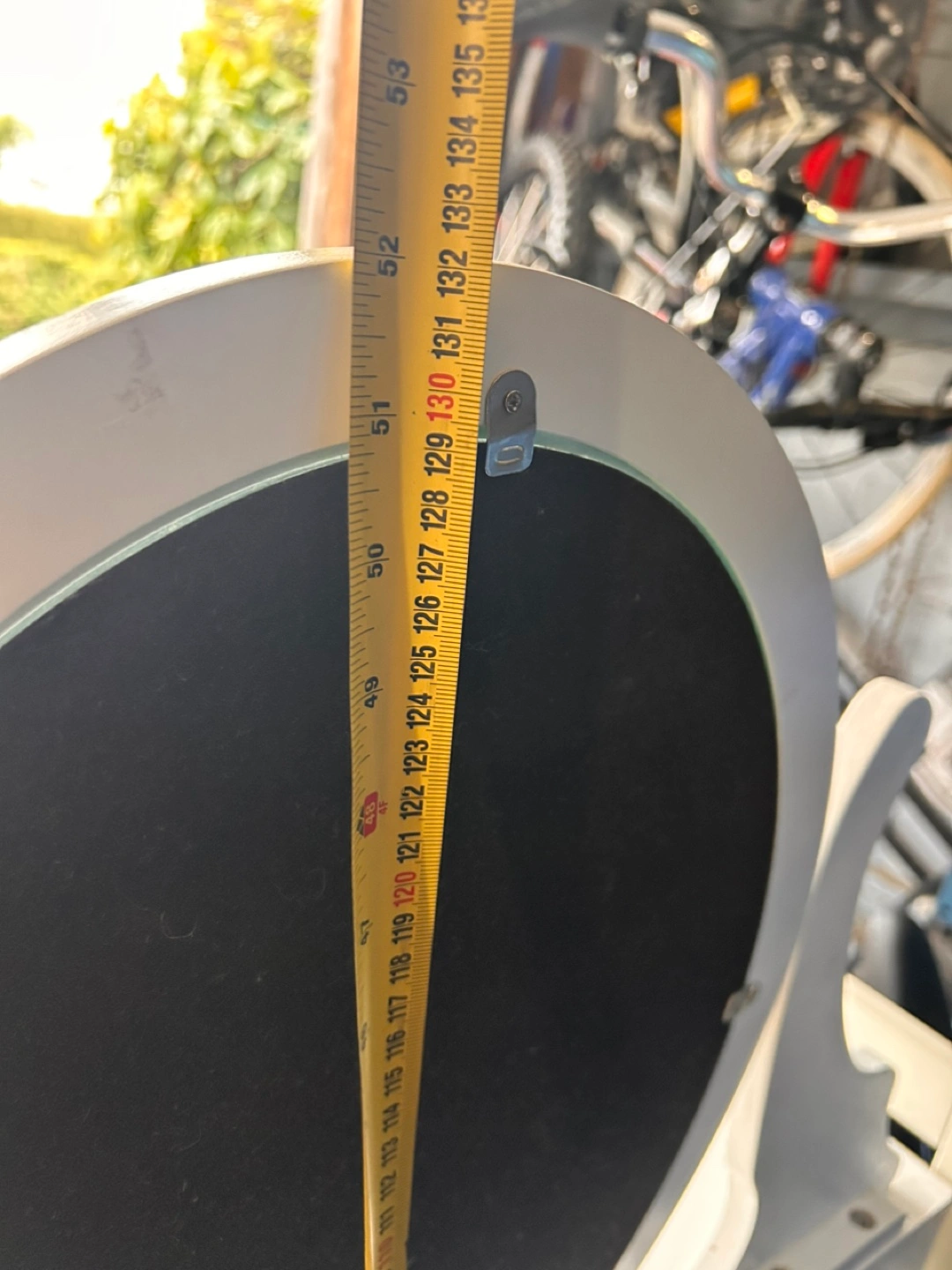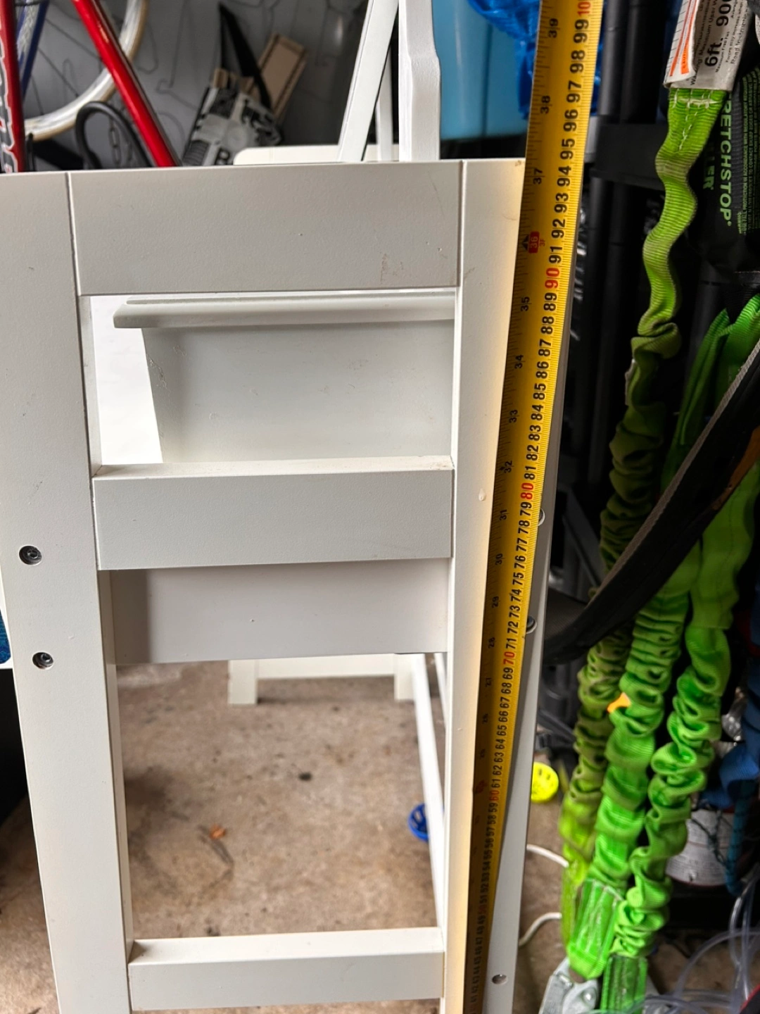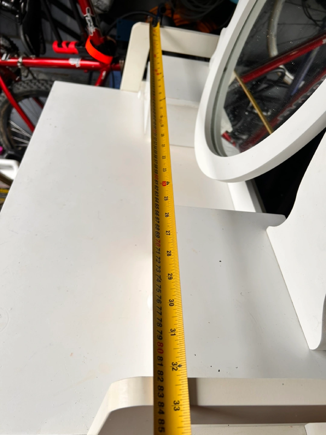 White vanity desk with oval mirror and three drawers. Structurally sound, but with cosmetic flaws, i.e. stains. One sticker on the side. Mirror and top drawers are detached.