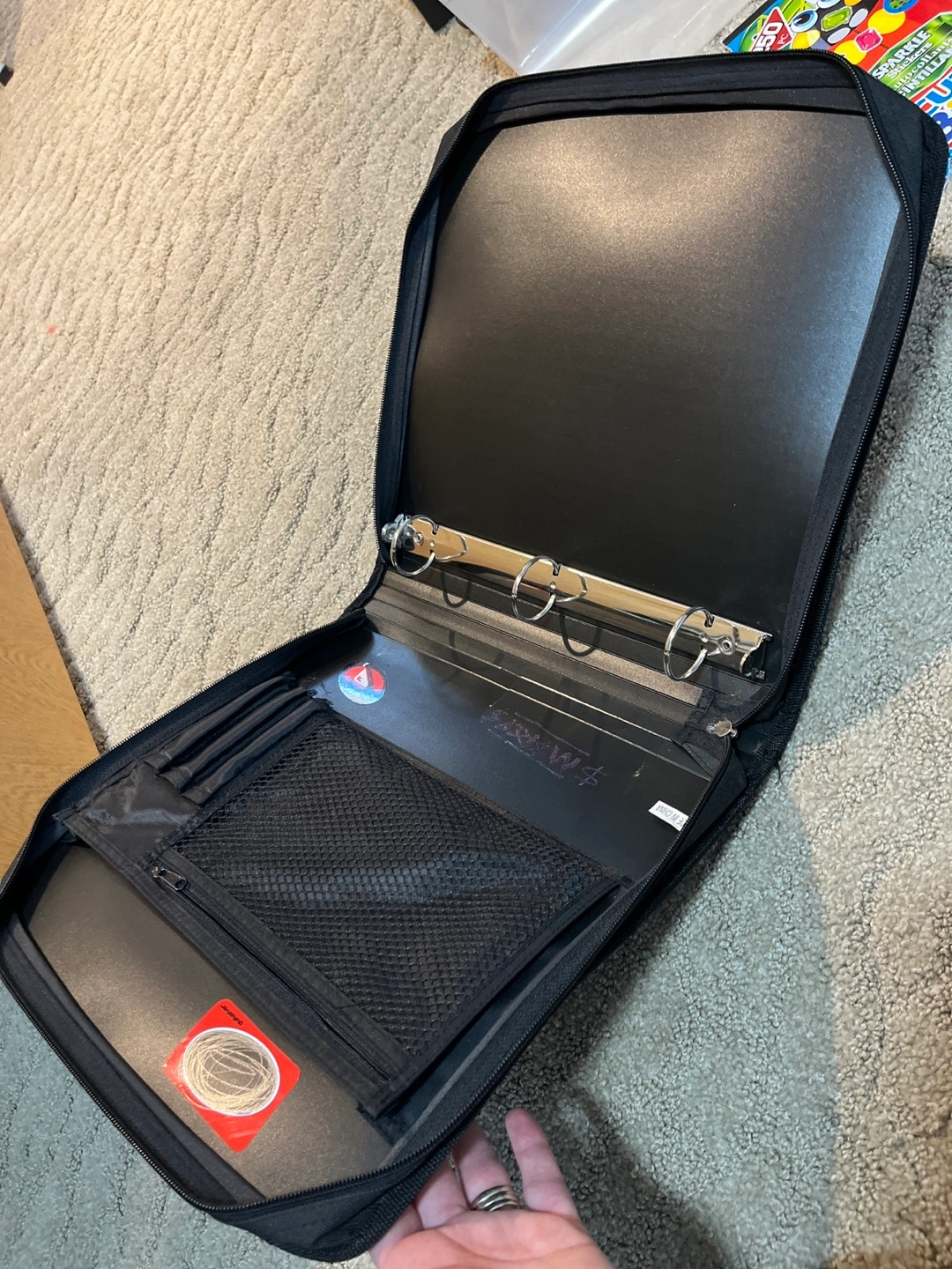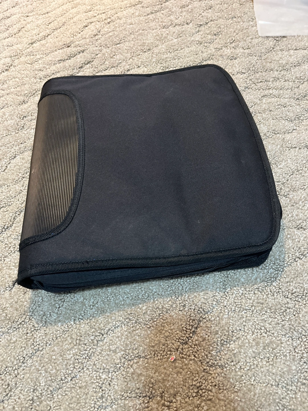 Durable black binder portfolio. Three-ring binder mechanism. Interior pockets and zippered closure. Great for organizing papers and documents.