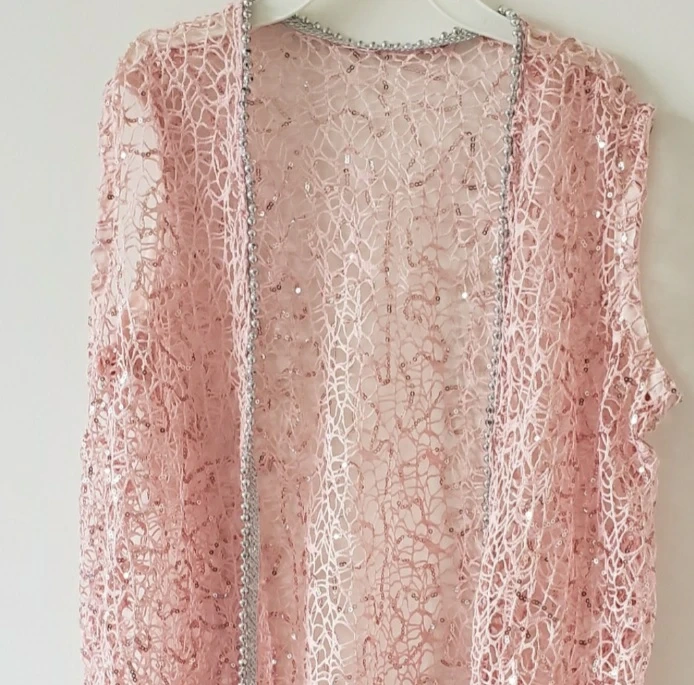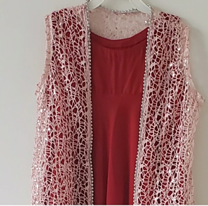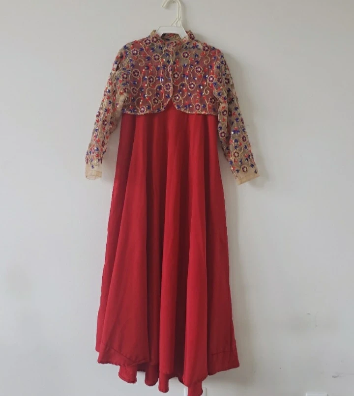 For 8- 10 year olds ** Custom made Versatile sleeveless red maxi dress can be worn three ways; by itself, with the pink sequenced gown or with the embroidered fancy koti(short jacket) for more formal occasions. The short jacket is fully embroidered with multi coloured thread and sequins. **Please check measurements for a more accurate idea of the size, and whether it would fit a particular age.** All measurements are approximate. Measurements: Maxi dress: Size: 30 Dress length: 44 inches Shoulders: 11.5 inches Chest: 30 inches Pink gown: Length: 26 inches Shoulders: 14 inches Embroidered koti (short jacket): Length: 9 inches Sleeves: 15.5 inches Shoulders: 12.5 inches Condition: The maxi dress is slightly used, some threads are coming out. Gown and the short jacket are brand new. Fabric material: Georgette