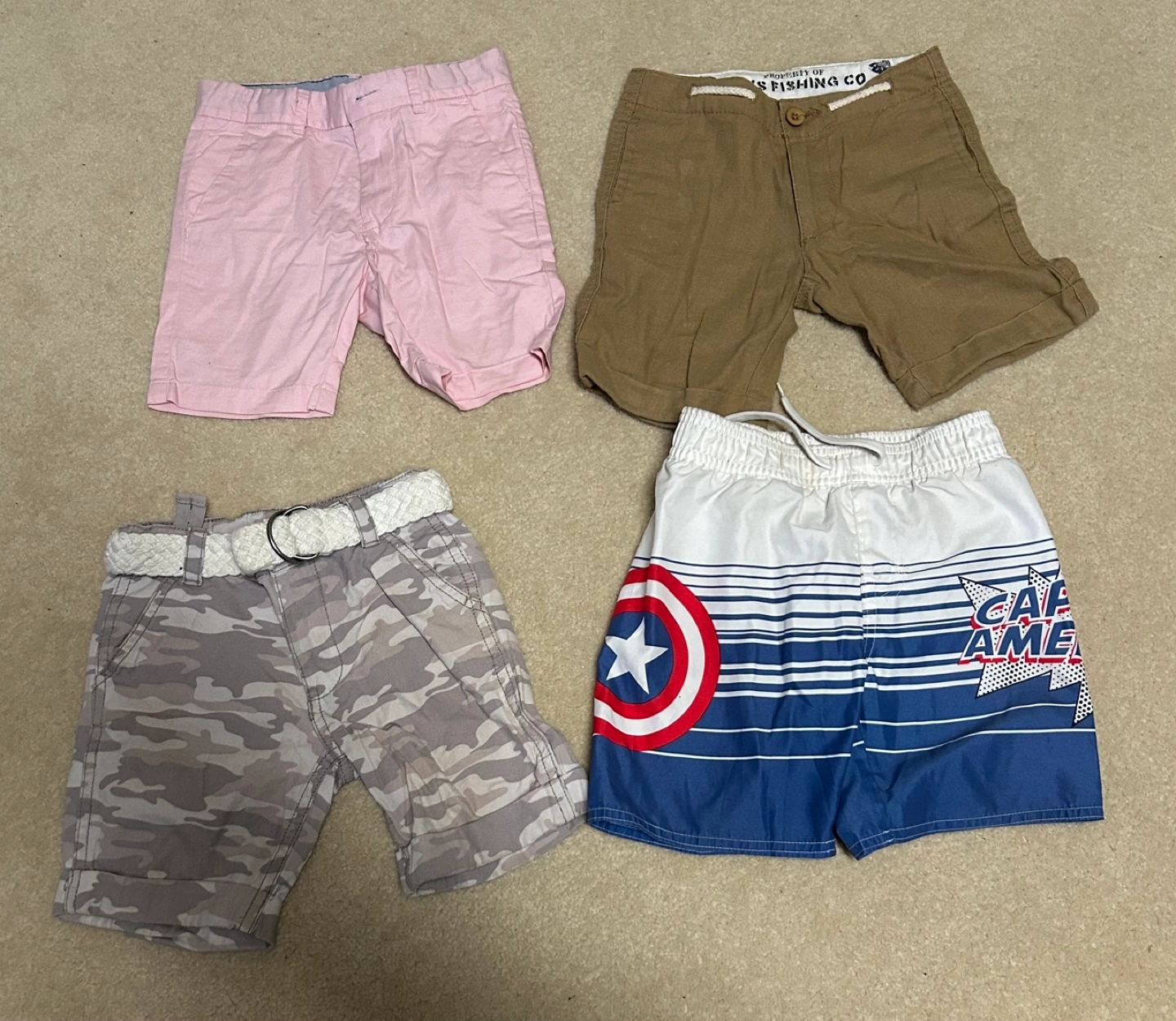Four pairs of boys' shorts in various colours and patterns. Pink, brown, camouflage, and Captain America-themed swim trunks. Good condition.