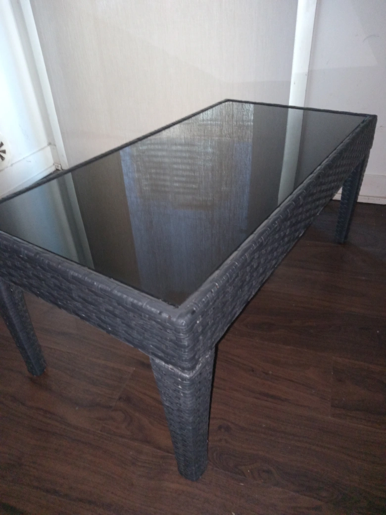 Stylish coffee table. Features a black wicker frame and a sleek black glass top. Perfect for a modern living room.