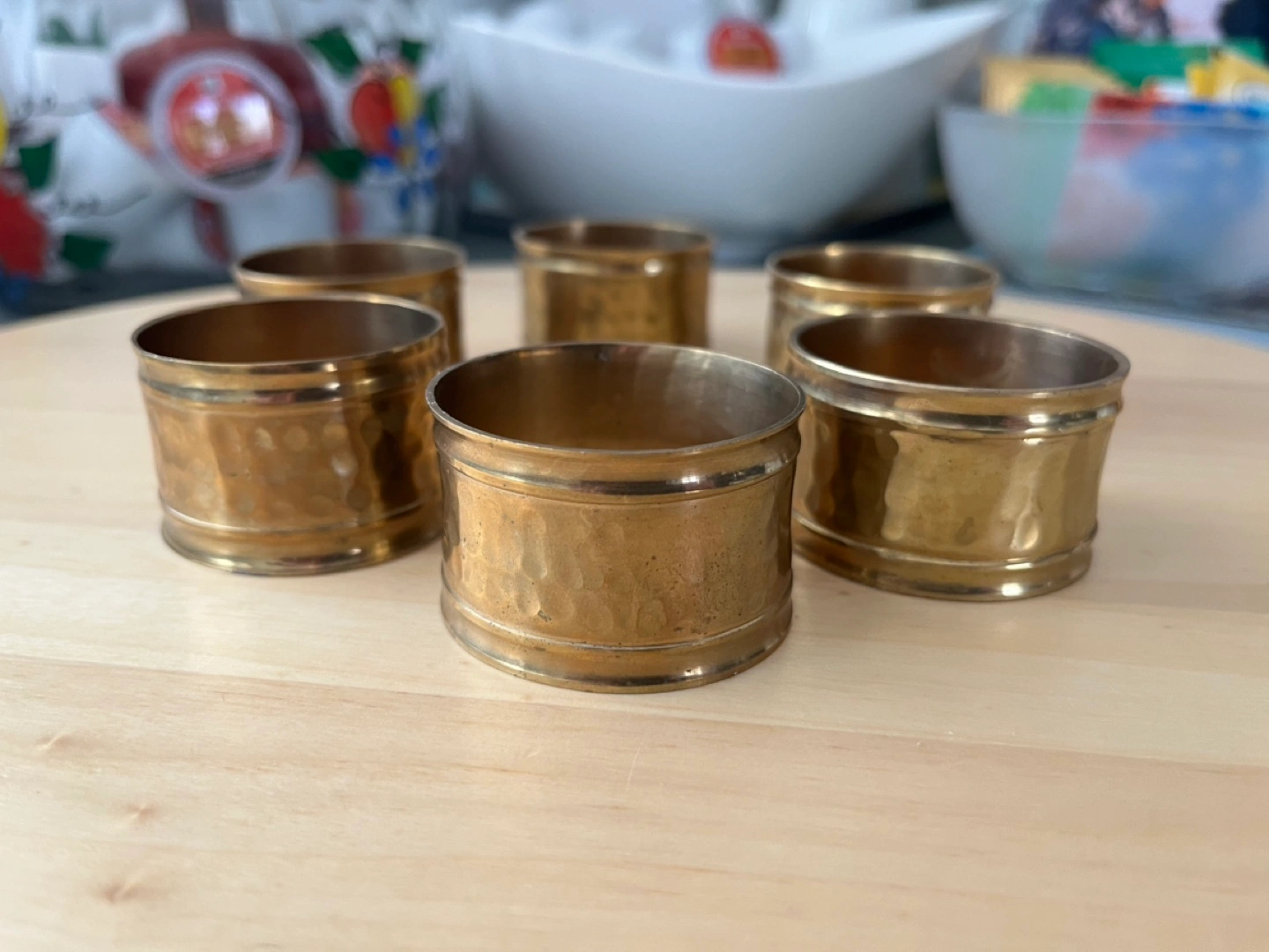 Six beautiful gold hammered brass napkin rings. Perfect for adding a touch of elegance to your table setting. Great for everyday use or special occasions.