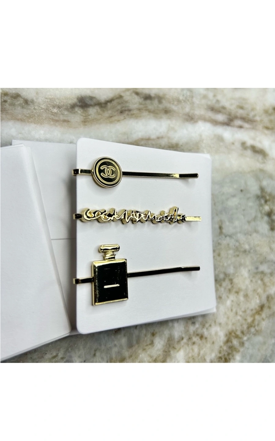 Three Chanel Gold-tone hair clips. Featuring: ✨ 1 pin with Coco Mademoiselle script ✨ 1 pin with the iconic Chanel Parfum bottle. ✨ 1 pin with Chanel’s CC logo ✨ New, unused. Perfect for yourself or as a gift. * Gift given to VIP clients at Chanel Beauty counter. - Cash or e-transfer accepted - Pickup or can mail through Canada post