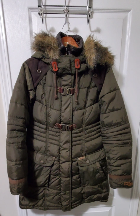 In excellent condition. Infrequent wear. Quality winter jacket. Extremely Warm. Color Olive green. Faux fur trimmed hood. Zipper and button closure. Multiple pockets. Includes an inner layer. Fits more like a large.