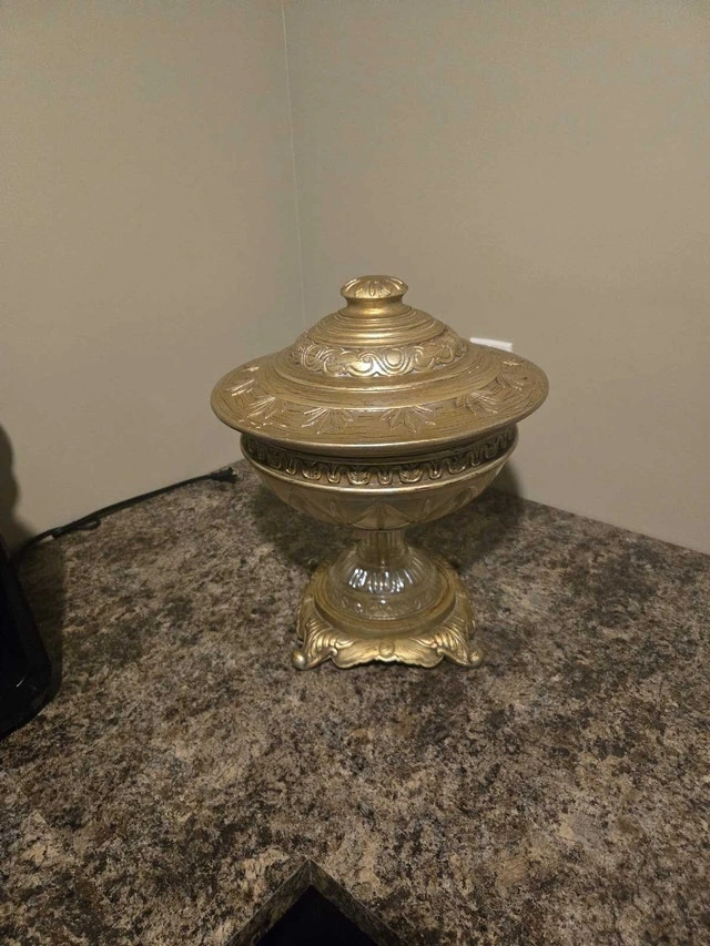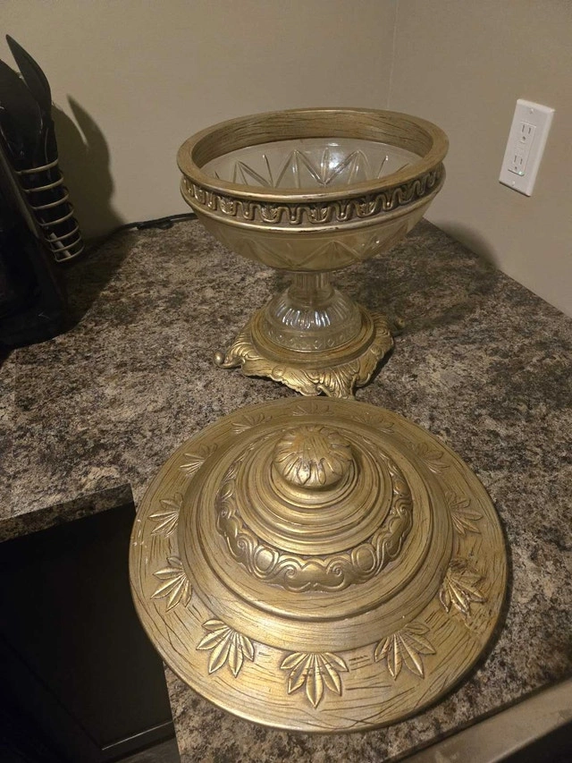 This is a beautiful, used decorative bowl with a lid, perfect for adding a touch of elegance to any room. The bowl features an ornate design and a golden finish, making it a standout piece, ready to be placed on your dining room table. A unique decor item. Colour: Gold. Cash accepted.