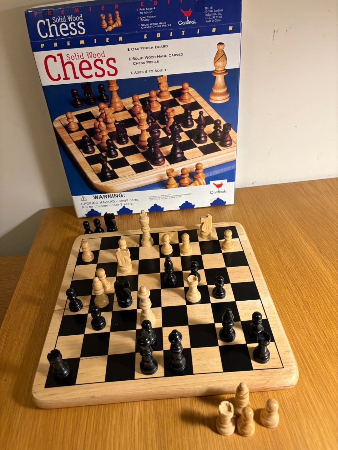 Cardinal brand chess set. Solid oak finish board and hand-carved chess pieces. Includes all pieces. Great for families or chess enthusiasts. Ages 4 to adult. Like new. In original box with instructions.