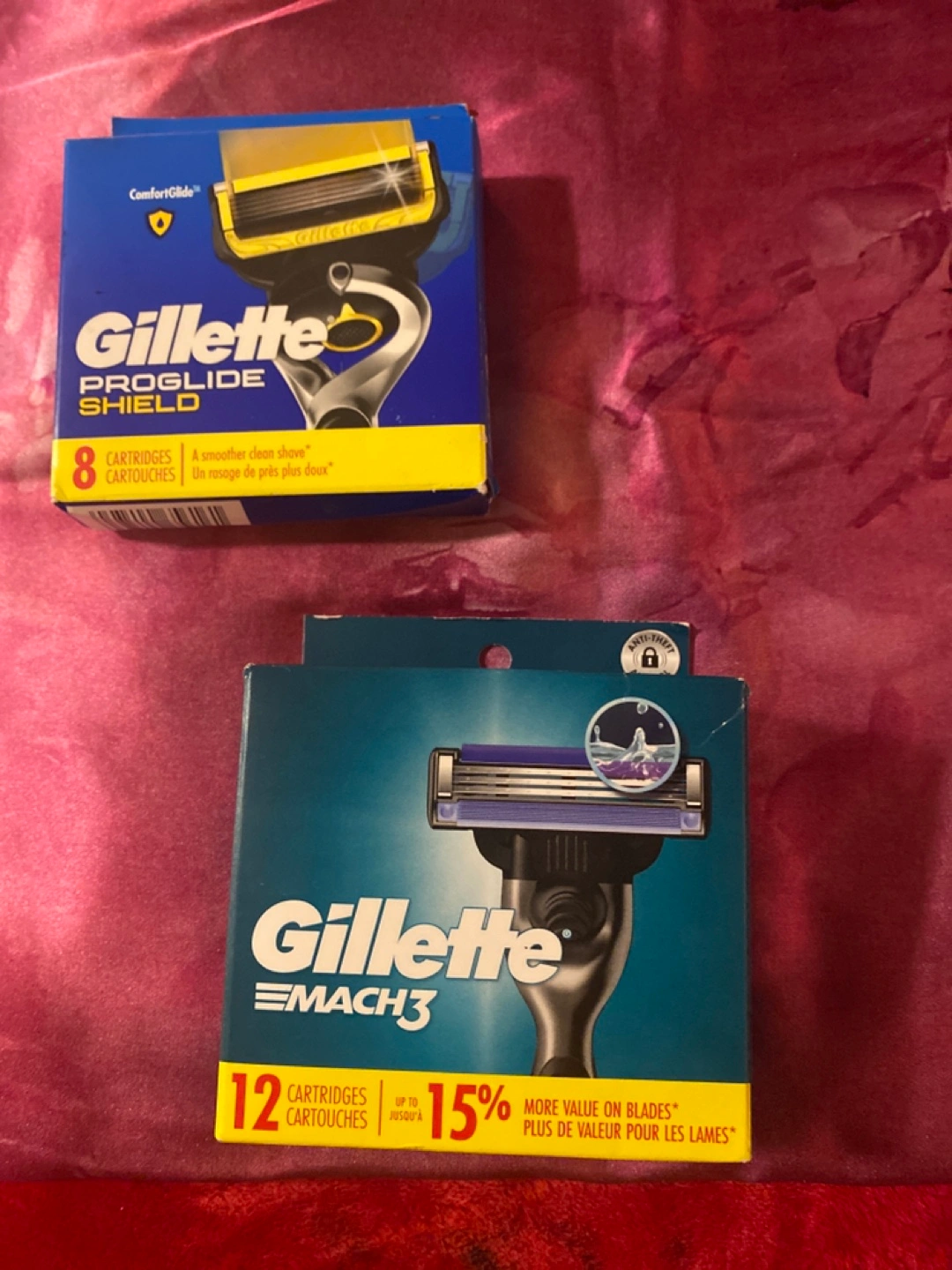 Two packs of Gillette razor cartridges.