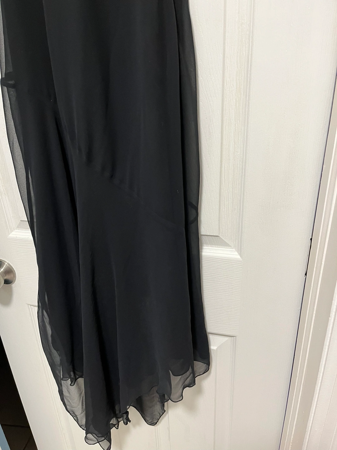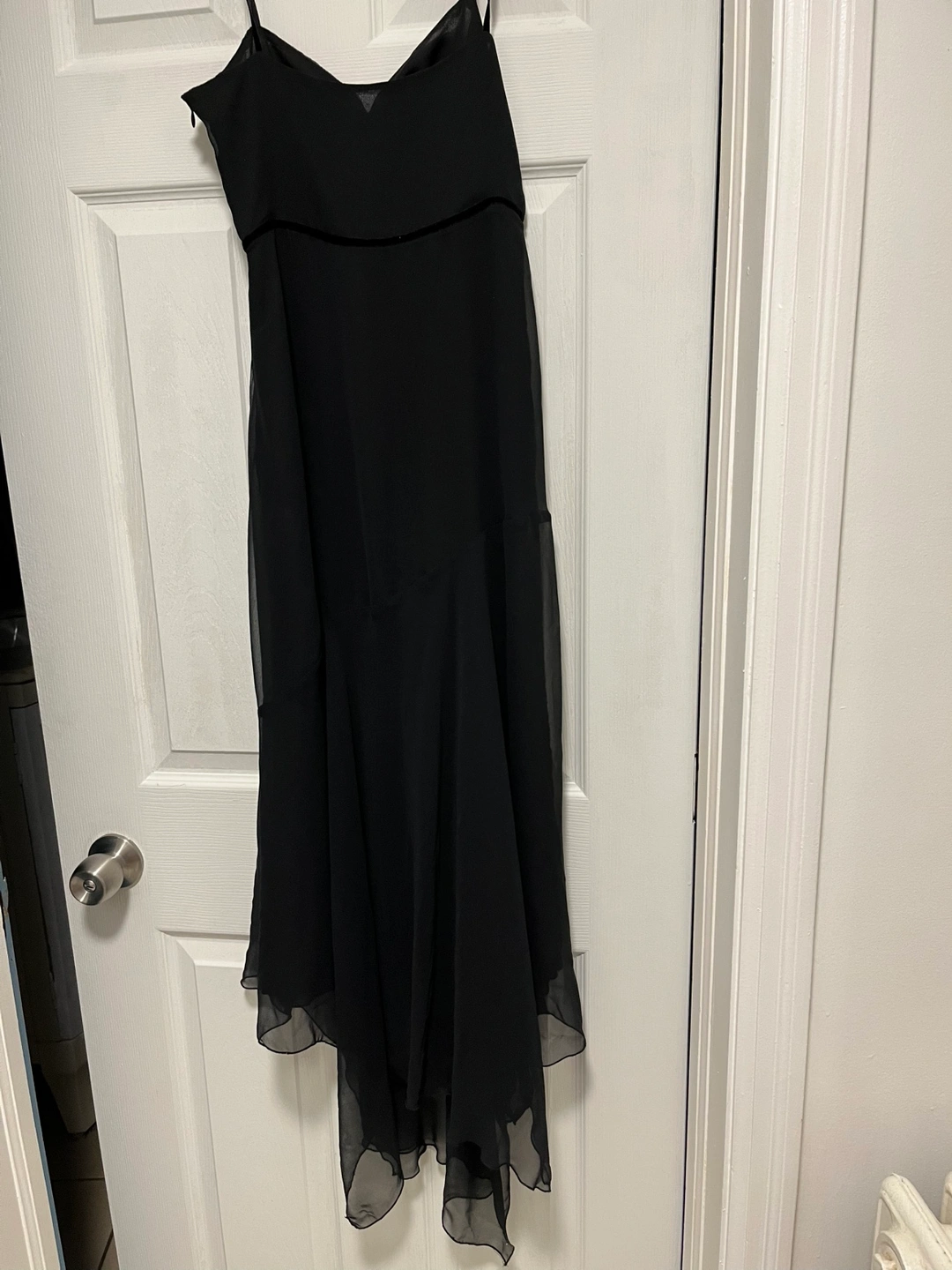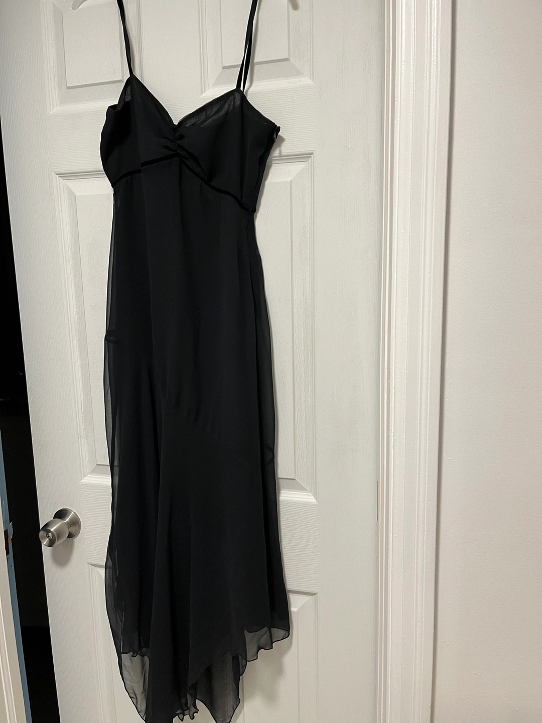 Beautiful black maxi dress. Features thin straps, a fitted bodice, and a flowing chiffon skirt. Perfect for a formal occasion or a night out.