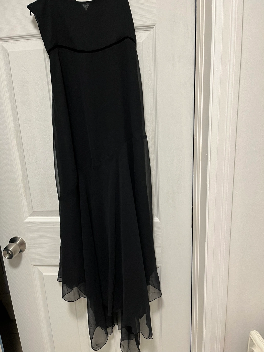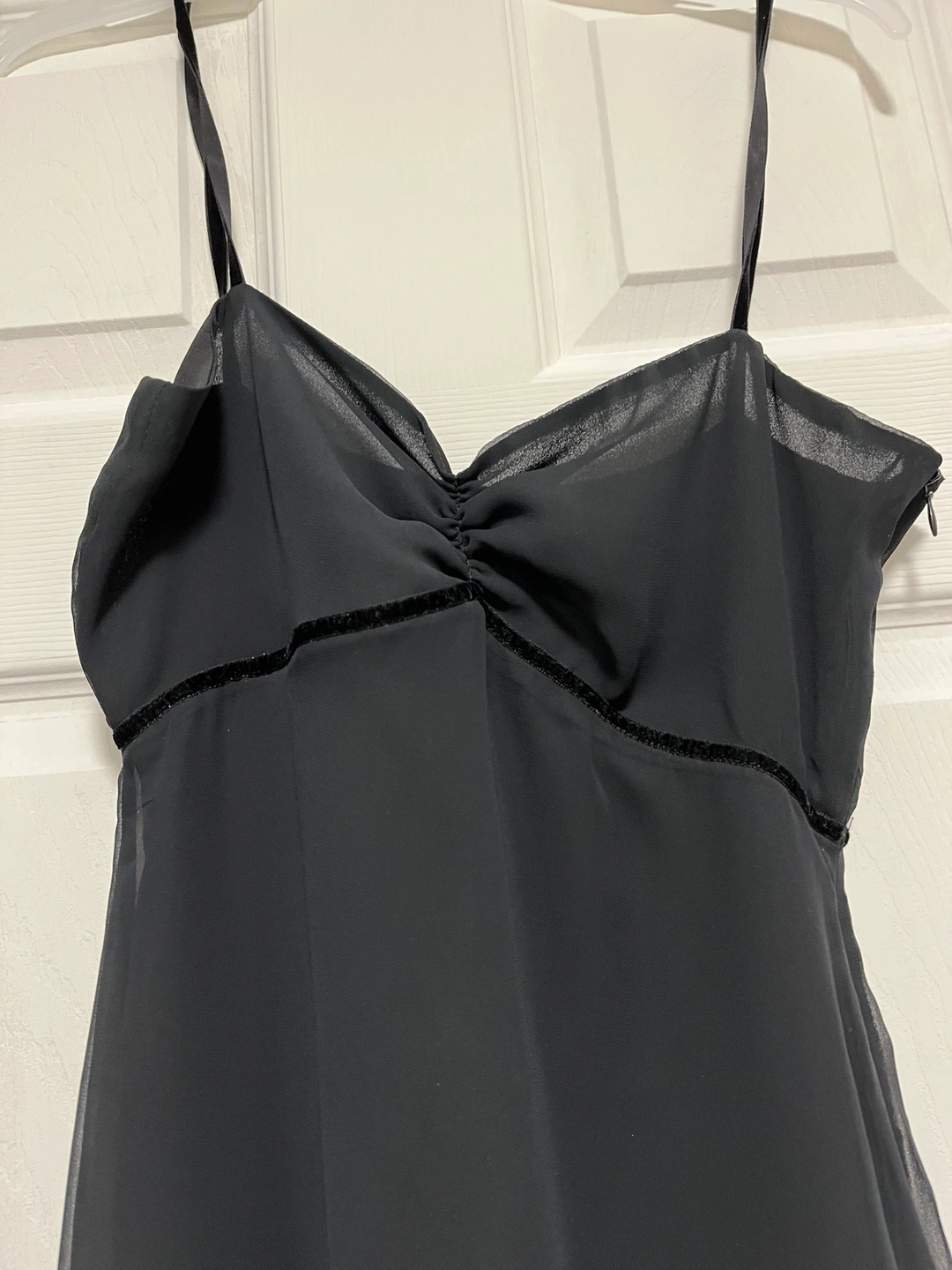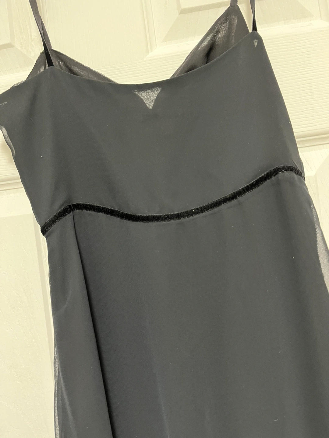 Beautiful black maxi dress. Features thin straps, a fitted bodice, and a flowing chiffon skirt. Perfect for a formal occasion or a night out.