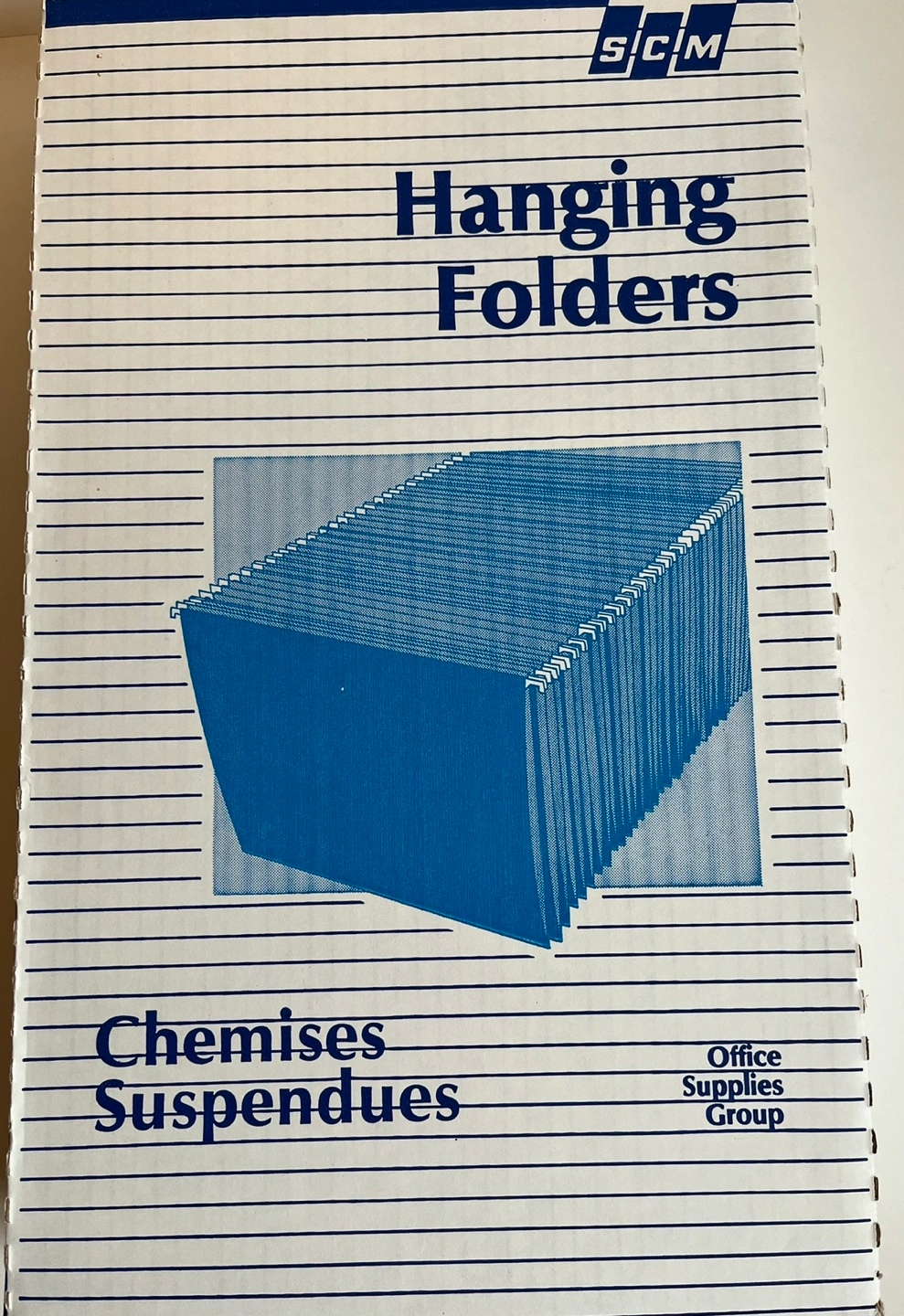 Two boxes of 25 legal size hanging folders, ideal for office use. One box in blue and one box in yellow. By SCM Office Supplies Group. New and never used. $20 per box.