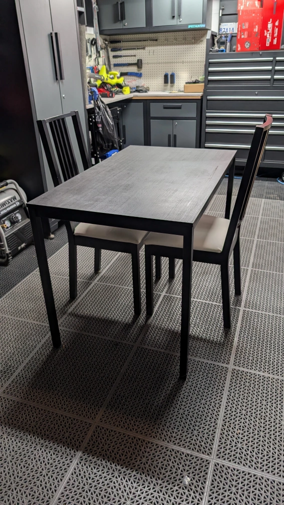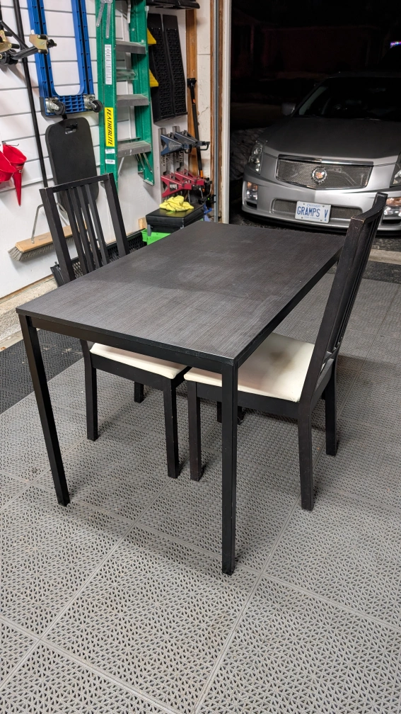 For sale is a kitchen table with two chairs. The table is in great shape, and one chair has a stain on it, but otherwise works as intended.