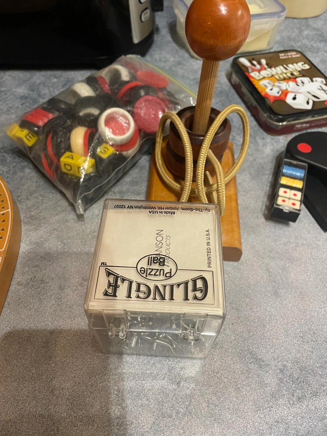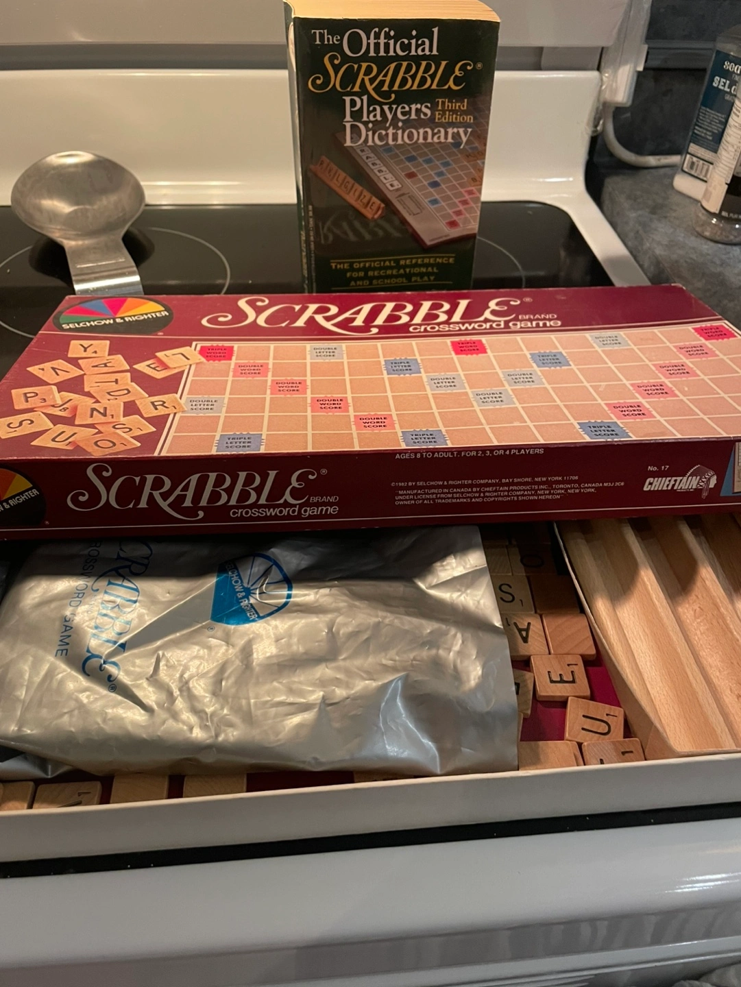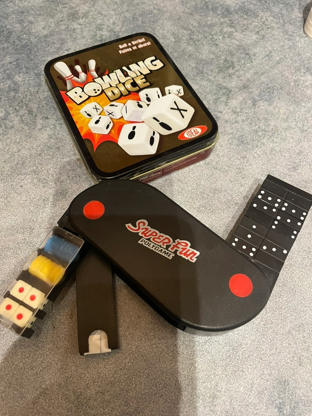 406Poker chips, retro scrabble, cribbage boards, puzzles, travel set, something called “Bowling Dice” (never opened), and a cool visual puzzle game called Pattern Stacker. Official Scrabble dictionary included.
