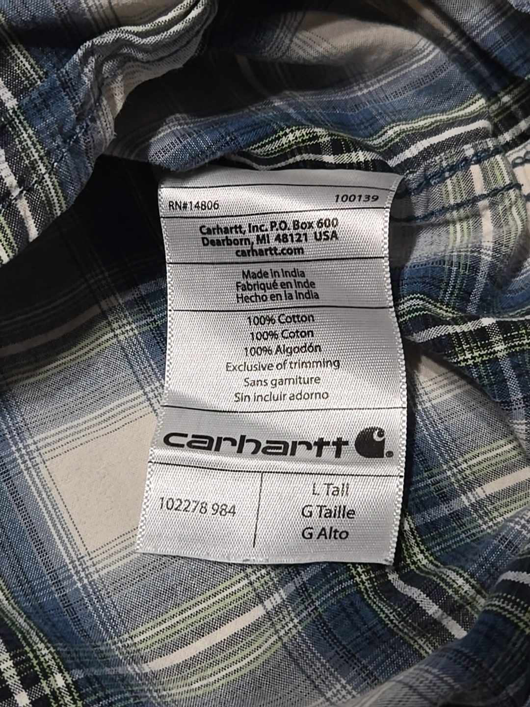 2 Men's long-sleeve Carhartt flannel shirt. Relaxed fit, size large tall. Brown, beige and blue plaid pattern. Made in India. 100% cotton.